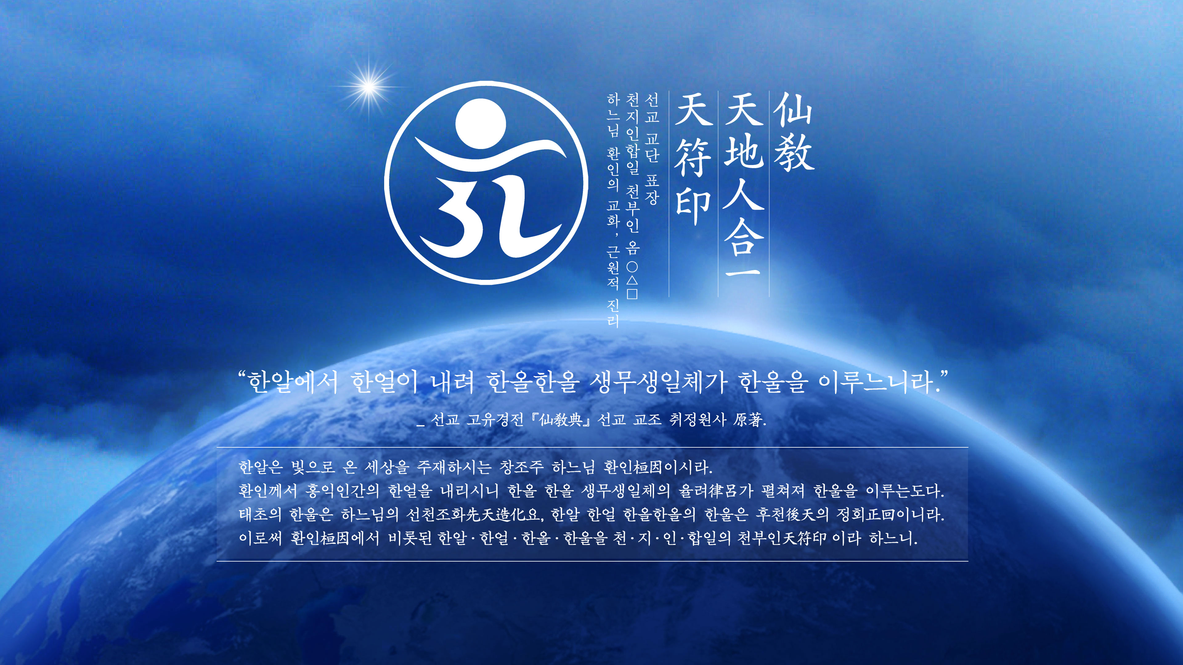 올해로 환기9218년 선기55년 선교개천34년 선교창교31년(창교30주년) 선교교단창설25년을 맞은 선교(仙敎)는 교조 취정원사(聚正元師)께서 설립한 선교환인집부회(仙敎桓因慹父會)를 모태로 하는 일교일종(一敎一宗) 민족종교 종단입니다.