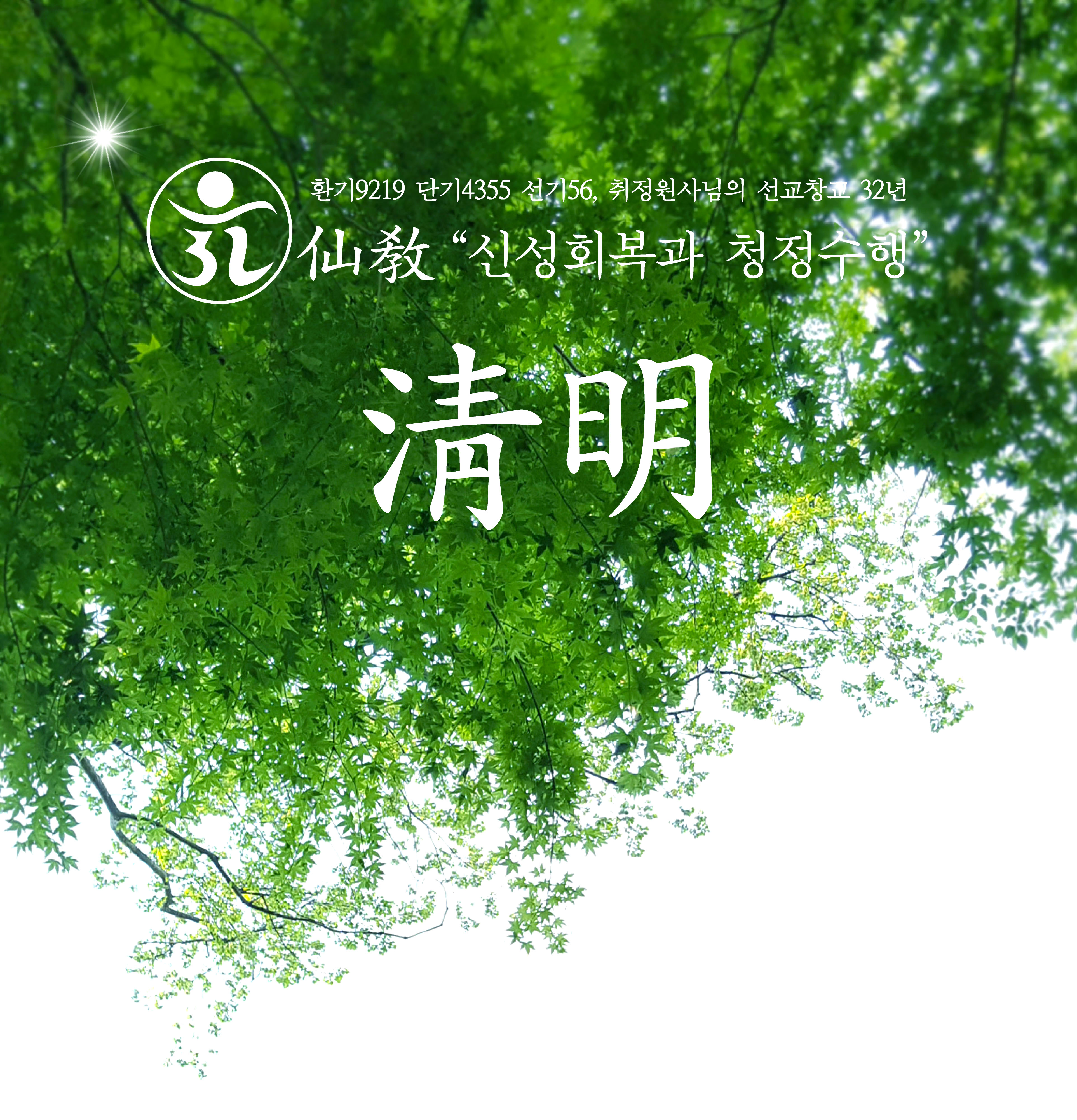 일체의 양기(陽氣)가 끊어진 동짓날 일 점(點)의 양기가 생(生)하니 이것이 곧 순양(純陽)이다. 순양의 기운은 동지·소한·대한(冬至·小寒·大寒)이 지나면서 음기(陰氣) 안에 보존되어 있다가, 입춘(立春)에 처음 모습을 드러내고 우수·경칩·춘분(雨水·驚蟄·春分)을 지나면서 자라나 청명(淸明)에 세상을 밝고 깨끗하게 비추니, 선교(仙敎)는 이러한 천지운행(天地運行)을 본받아 청명(淸明) 절기 선교 창교절(仙敎創敎節)에 신성회복대법회를 열어 선교 수행자의 신성발현을 돕고자 하는 것이다. 선교수행(仙敎修行)이 이렇듯 천지운행과 한 치의 어긋남 없으니, 선교를 일컬어 천지인합일(天地人合一) 선교(仙敎)라 한다. 》