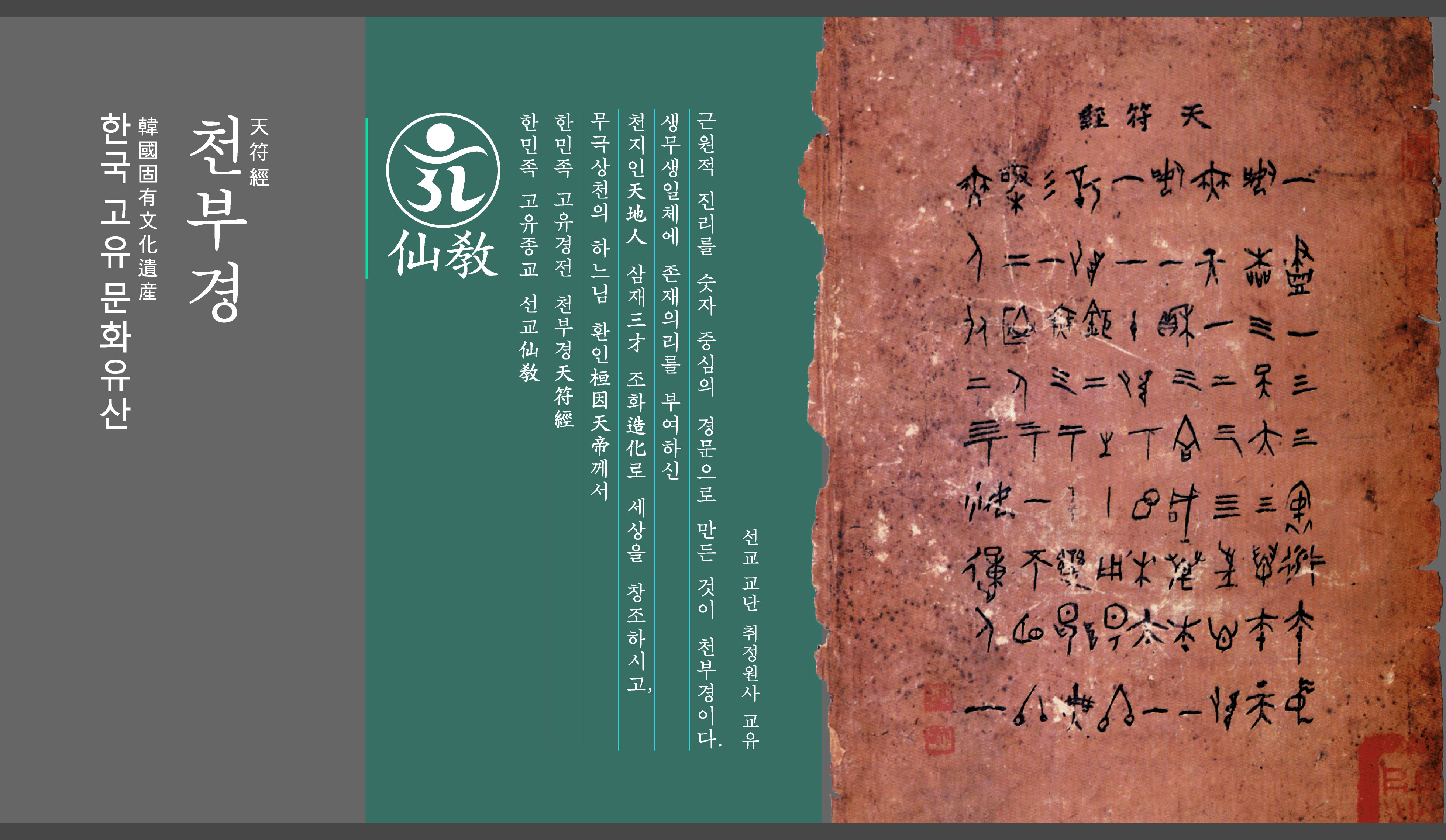 천부경은 하느님 환인(桓因天帝)께서 세상을 창조하신 한민족 창세기(創世記)의 기록이다. 천부경(天符經)은 일신(一神)이신 하느님 환인(桓因)께서 삼신(三神)으로 화(化)하시어 온 세상을 창조하시고 주재하시는 원리와 한민족의 우주관 그리고 환(桓)에서 시작되어 단(檀)과 한(韓)이 되는 신비로운 역사의 창조원리를 81자로 기록하고 있다.