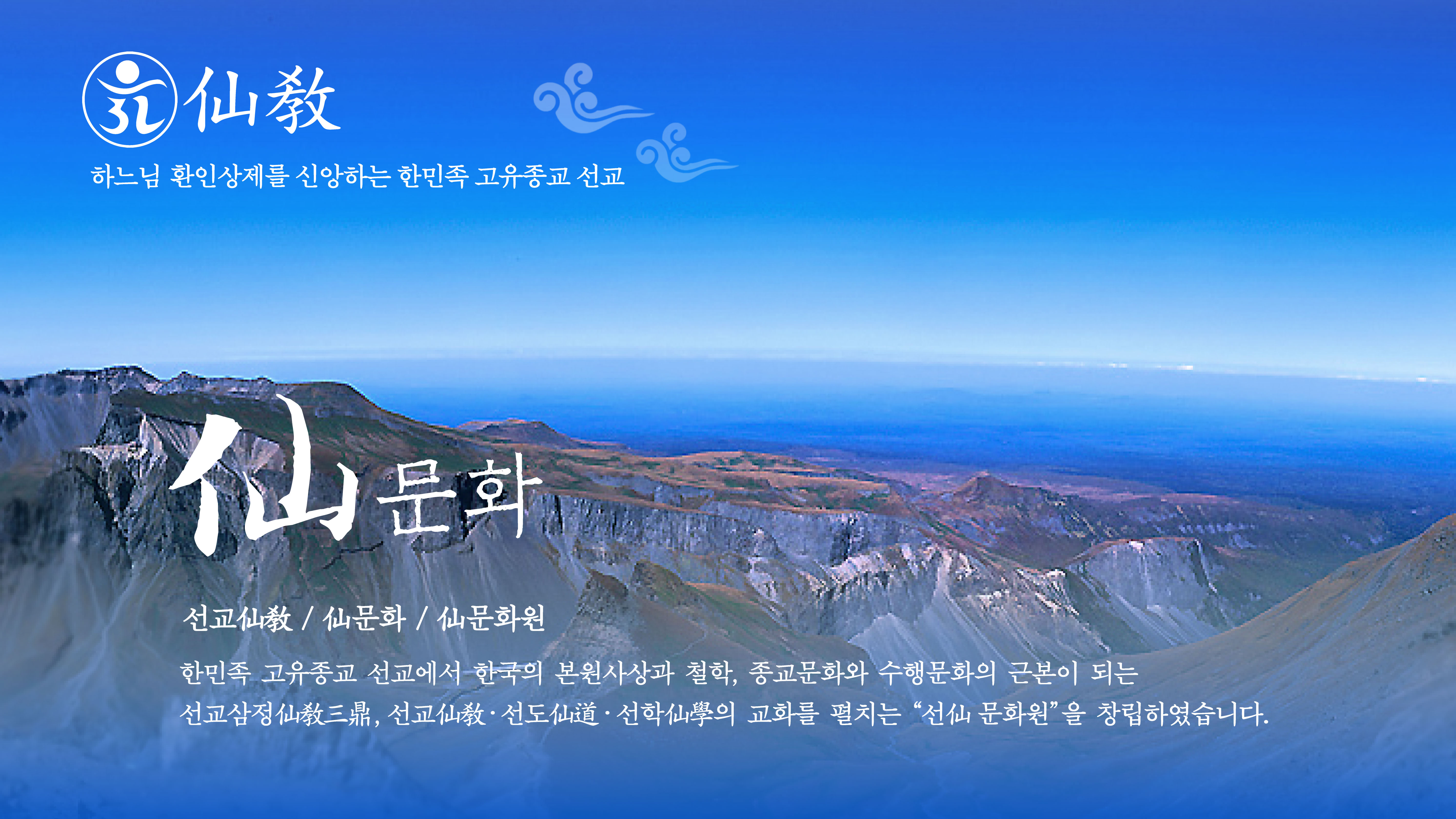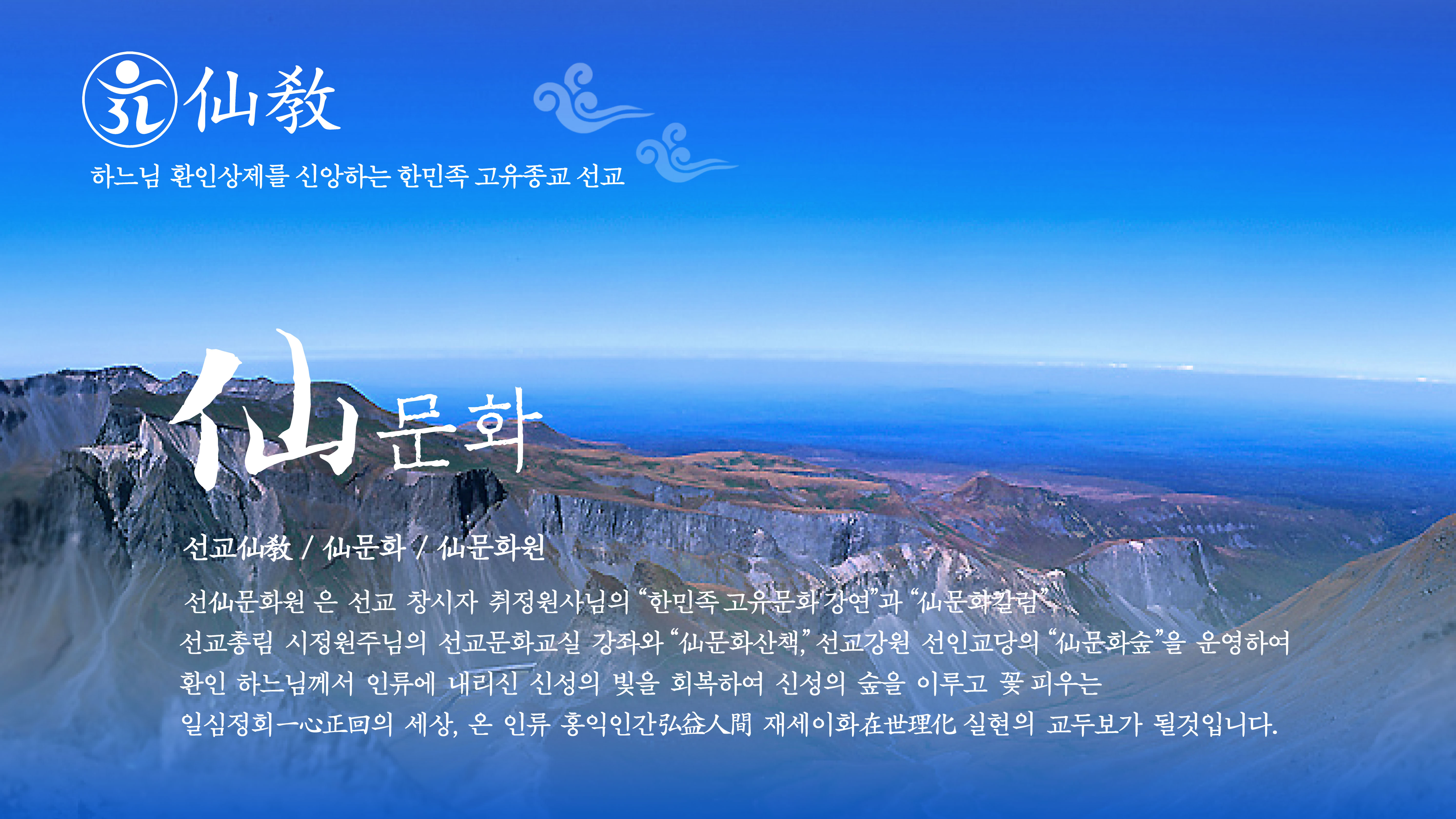 『仙문화원』은 / 한민족 고유의 종교 선교(仙敎) · 한민족 고유의 수행문화 선도(仙道) · 한민족 고유의 철학 선학(仙學) “선교삼정(仙敎三鼎)”을 확립한 선교 창시자 “취정원사님의 선(仙)사상”과 “천지인합일(天地人合一) 일심정회(一心正回)사상”으로 밝혀진 한민족 본원사상(韓民族本源思想)인 한민족 하느님 사상(桓因思想)의 부활을 위하여, 「하늘의 광명 환(桓) · 땅의 광명 단(檀) · 사람의 광명 선(仙)」을 깨달고, 하느님 환인께서 생무생일체에 내리신 빛의 씨앗 “신성”을 회복하여, 온 인류의 홍익인간 재세이화를 실현하는 민족종교 선교의 종교문화예술원 입니다.