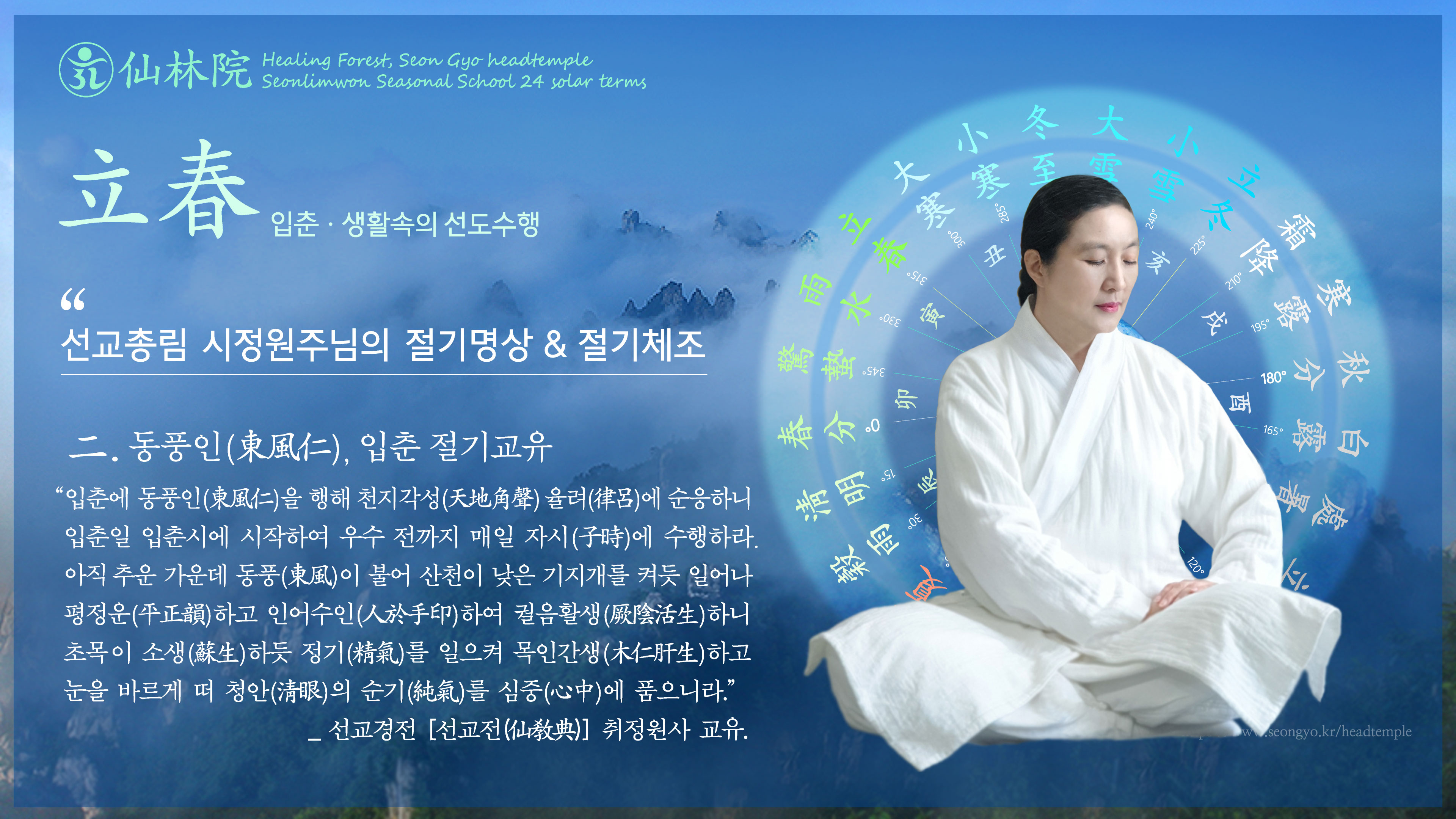 인터뷰365 임성규 기자 = 민족종교 선교(仙敎)와 선교총림 선림원은 2023년 2월 5일 계묘년 입춘(立春)을 맞아 24절기 선도수행 중 입춘절기의 선도선법 동풍인(東風仁)을 영상교화로 공개하고, 한