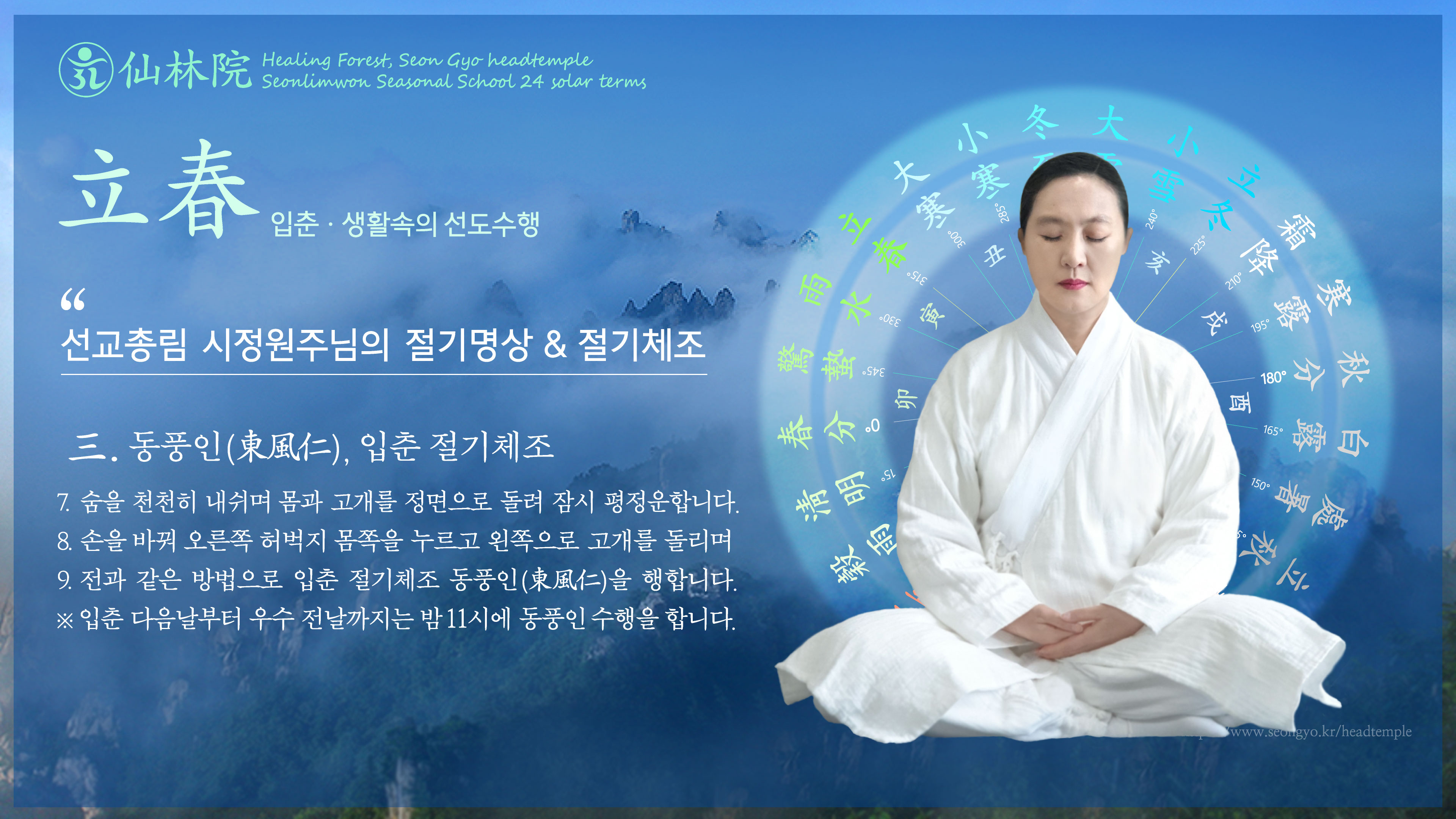[선교총림 시정원주님 선도선법(仙道禪法)] 입춘(立春) 절기명상 · 절기체조 입춘立春은 일년 절기력(節氣曆)의 첫번째 절기로 봄이 들어서는 절기. 황경 315도. 대한과 우수 사이에 듭니다. 입춘