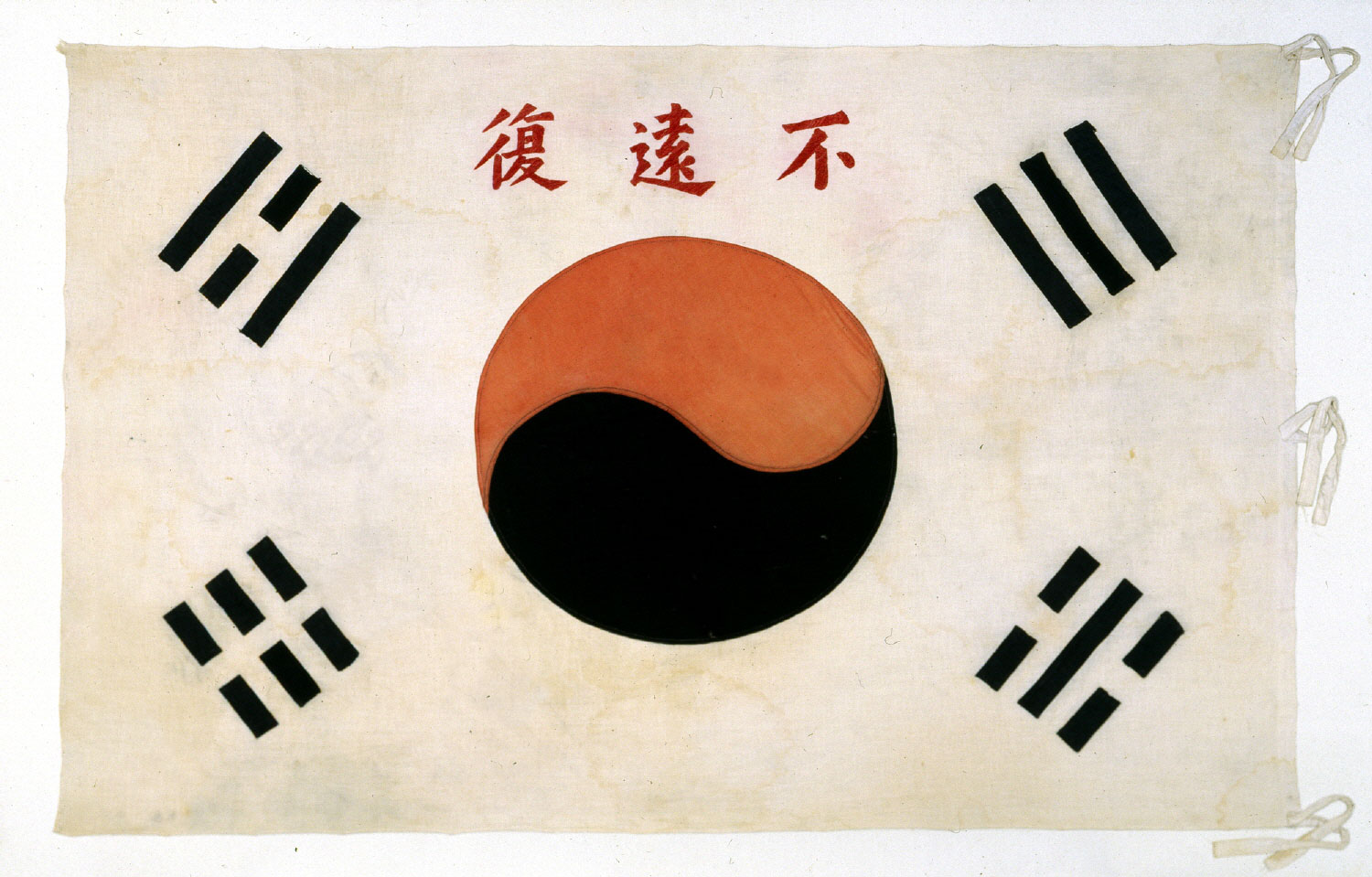 ▲ 불원복 태극기(不遠復 太極旗) : 대한민국 국가등록문화재 제394호 / 독립기념관 소장. / '머지않아 국권을 회복한다'는 不遠復(불원복) 글자가 수놓아진 항일독립운동의 표상 / 조선 말 전남 구례 일대에서 활약한 의병장 고광순(1848~1907)이 사용한 것으로 알려진 태극기