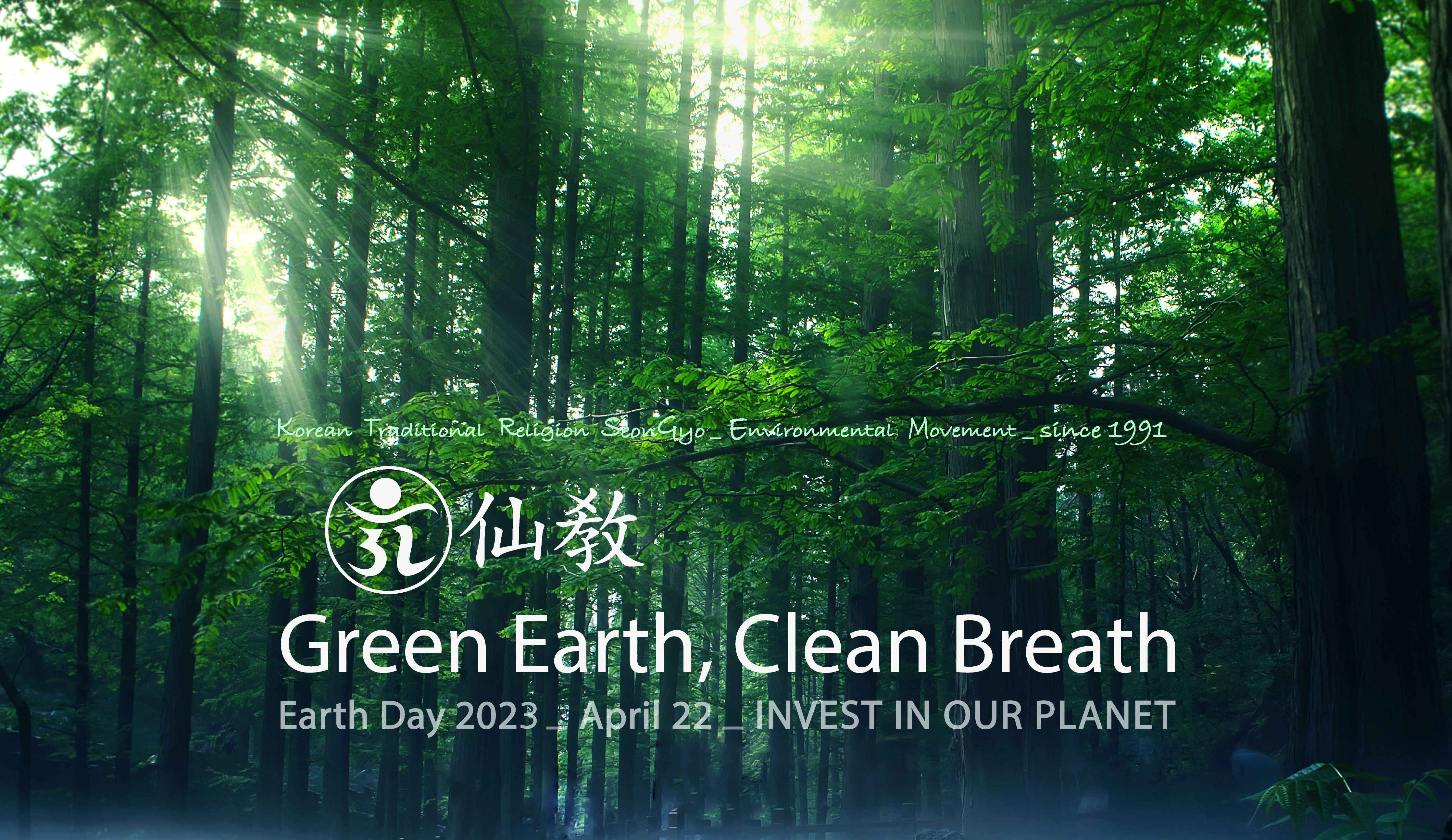 2023년 세계 지구의 날 주제는 2022년에 이어 ‘지구에 투자하자(INVEST IN OUR PLANET)’입니다. 선교종단 재단법인 선교는 환경부의 기후변화주간 운영취지 탄소중립을 실천하고 환경보전의 의미를 되새기며, 매년 24절기 청명부터 곡우 절기 즈음까지 선교 창교절 제천의식과 지구의 날 기념행사를 열어 ‘푸른지구 맑은숨’을 주제로 인류의 신성회복 기원이 담긴 신단수 숲을 조성해왔습니다.