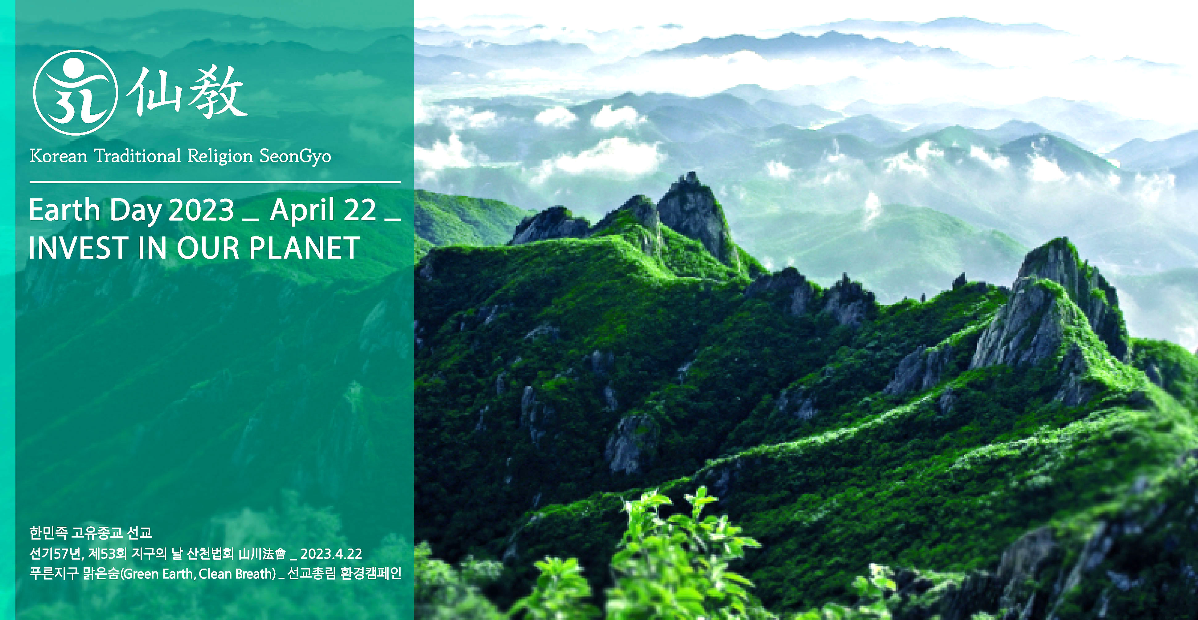 한국의 민족종교 선교(仙敎)는 지난 4월 22일 53회 ‘지구의 날(Earth Day)’을 맞아 선교총림 선림원(仙林院) 주관으로 선교 교조 박광의(朴光義) 취정원사(聚正元師)님의 선교 창교 33년을 기리는 신성회복대법회(神性回復大法會)와 함께 산천법회(山川法會)를 개최하여 한민족 고유의 선도 수행(仙道修行)으로 ‘푸른별 지구의 신성회복’을 실현하는 ‘푸른지구 맑은숨(Green Earth, Clean Breath)’ 캠페인을 진행했습니다.