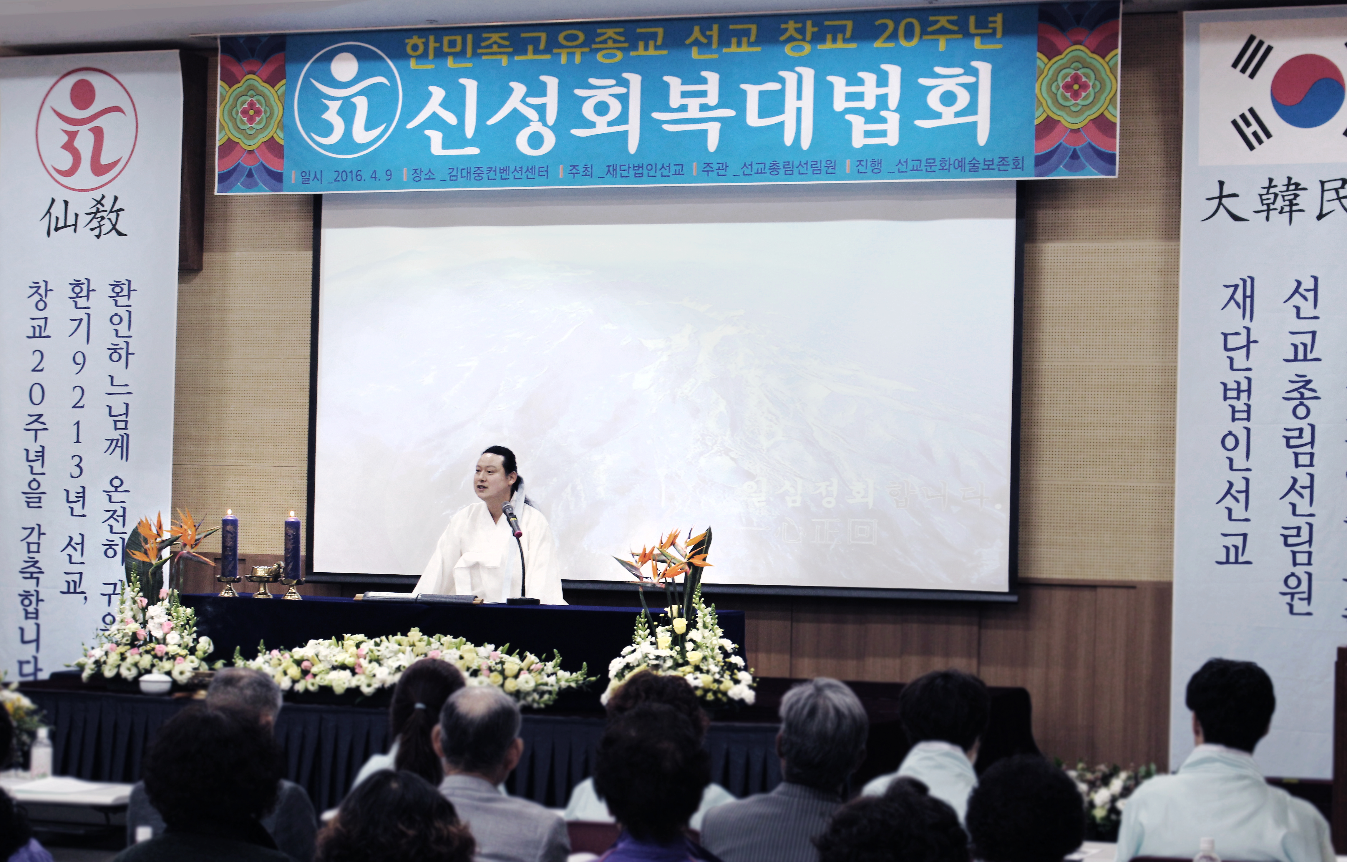 156. 프라임경제 선교창교주 취정원사는 9일 “정회(正回)의 때에 이르렀으니 신성을 회복하고 민족정기를 부활하라”고 말했다. 한민족고유종교인 재단법인선교는 이날 오전 10시 김대중 컨벤션센터에서 창교 20주년을 맞아 대외선포식 및 포덕교화사업을 위한 신성회복대법회를 개최했다.(2016.4.9)