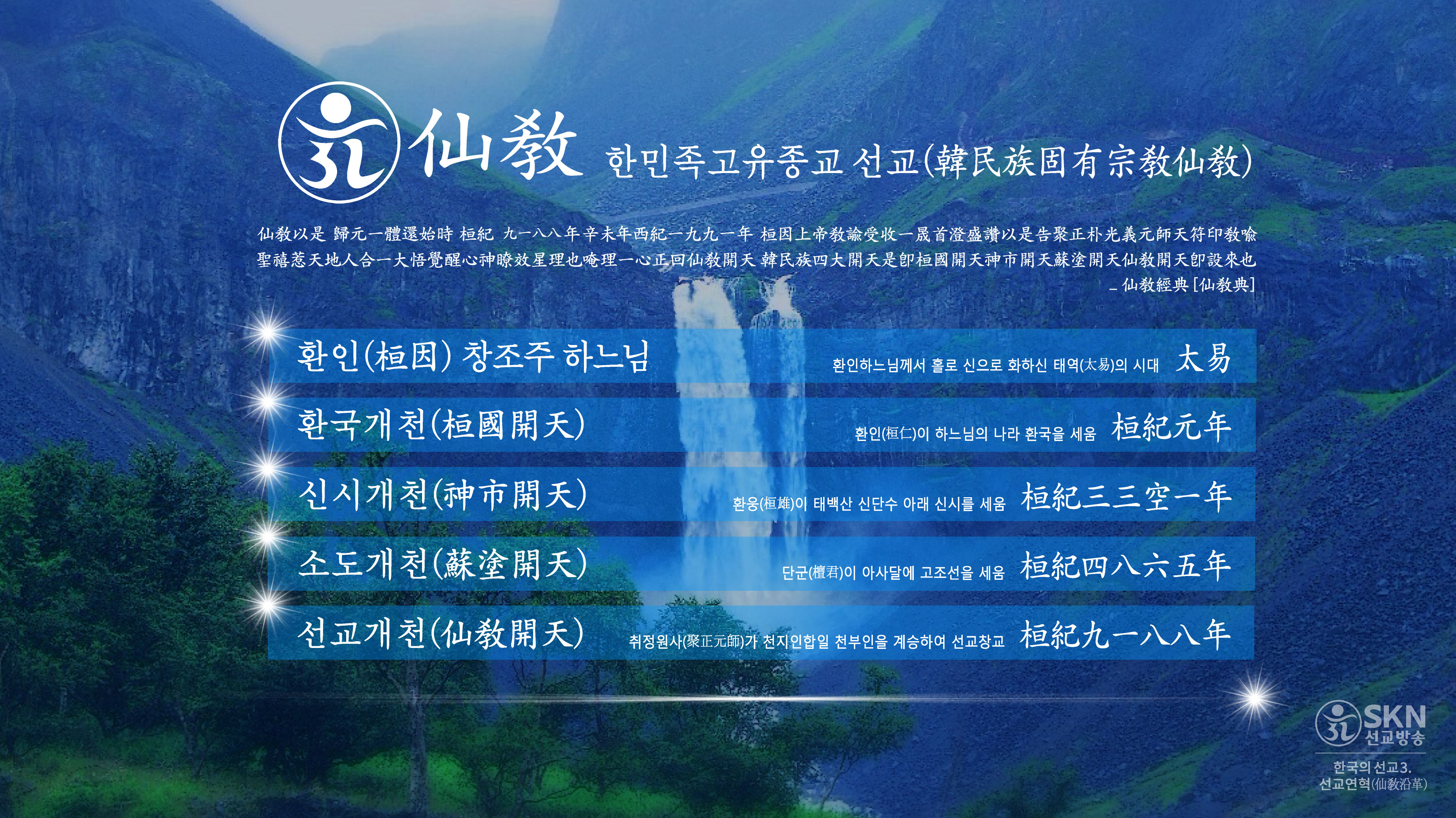 선교 개천 仙敎開天 하느님 환인(桓因) 태역 · 환인(桓仁) 환국개천 · 환웅 신시개천 · 단군 소도개천 · 취정원사 선교개천