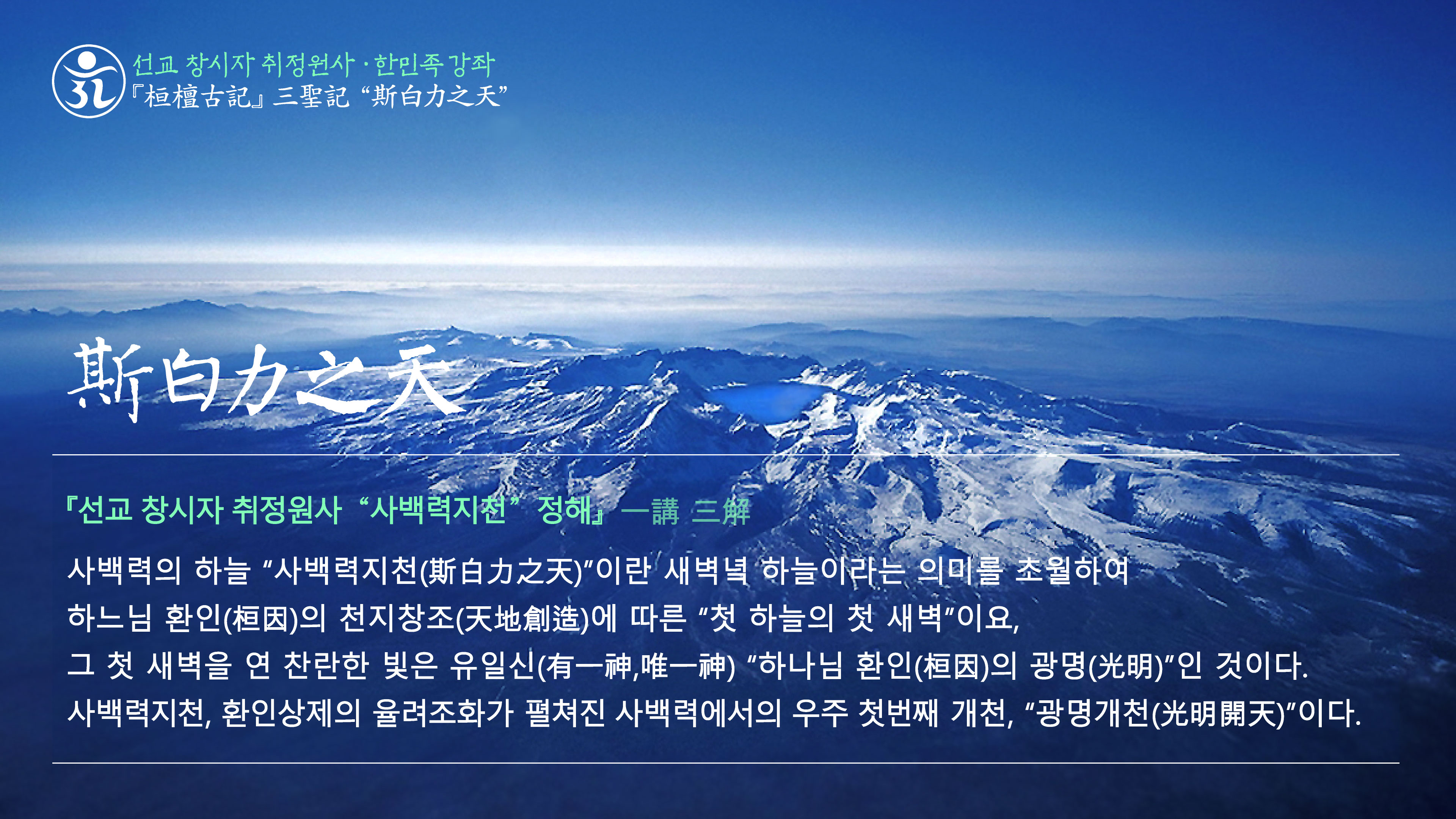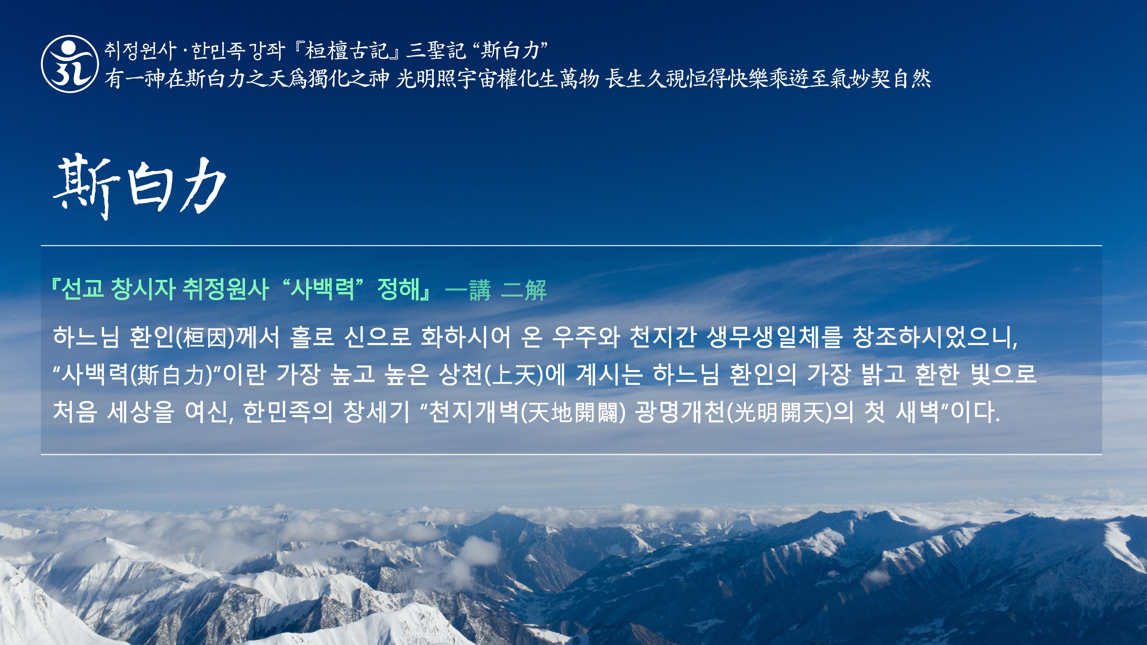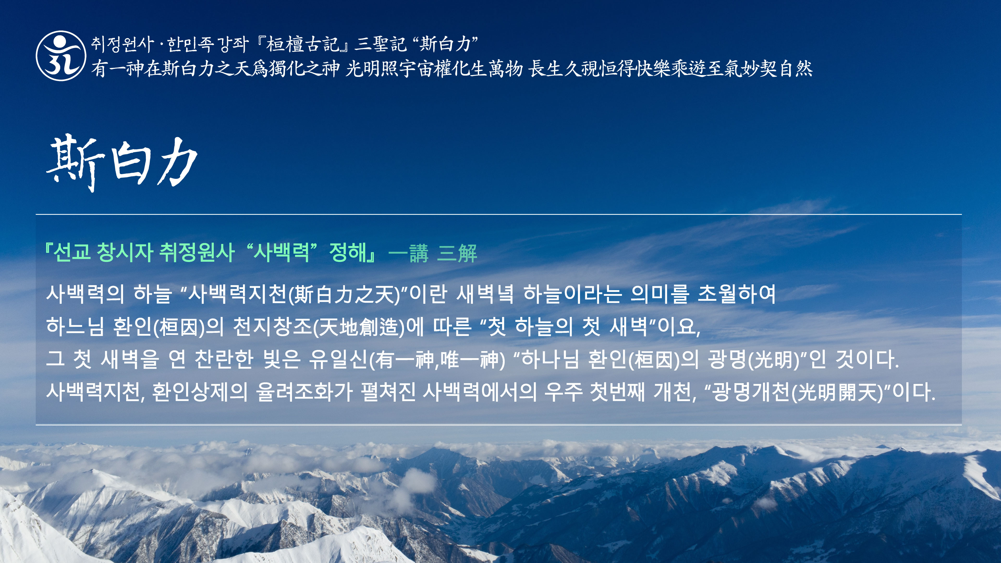 취정원사 한민족강좌 “광명사상” 有一神在斯白力之天爲獨化之神 光明照宇宙權化生萬物