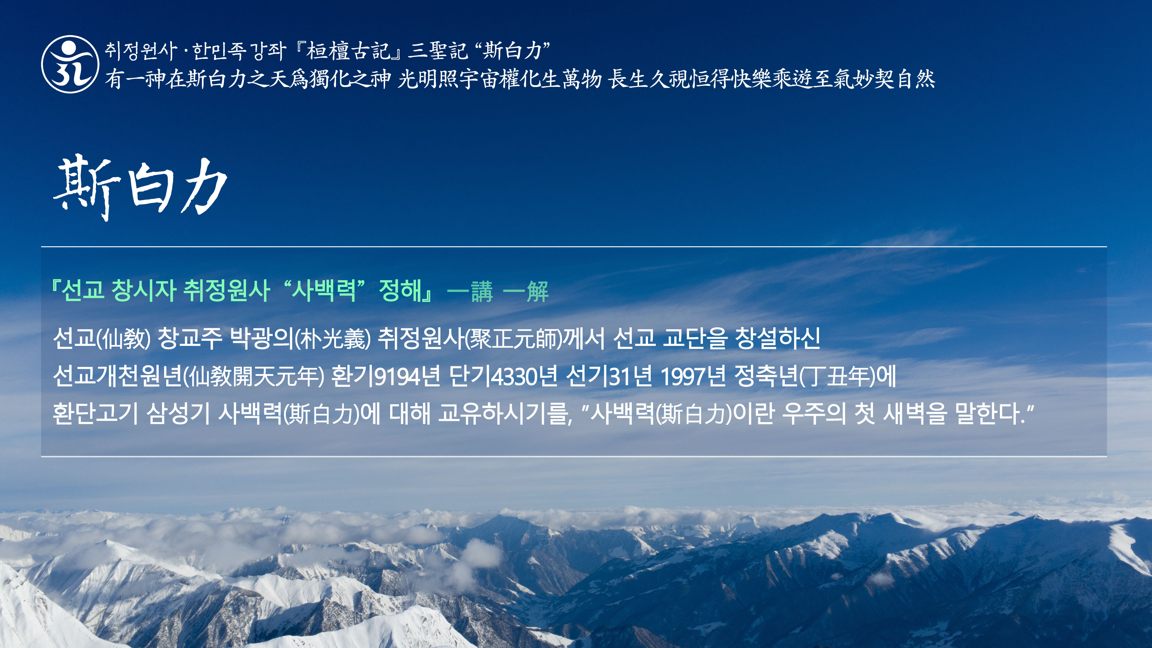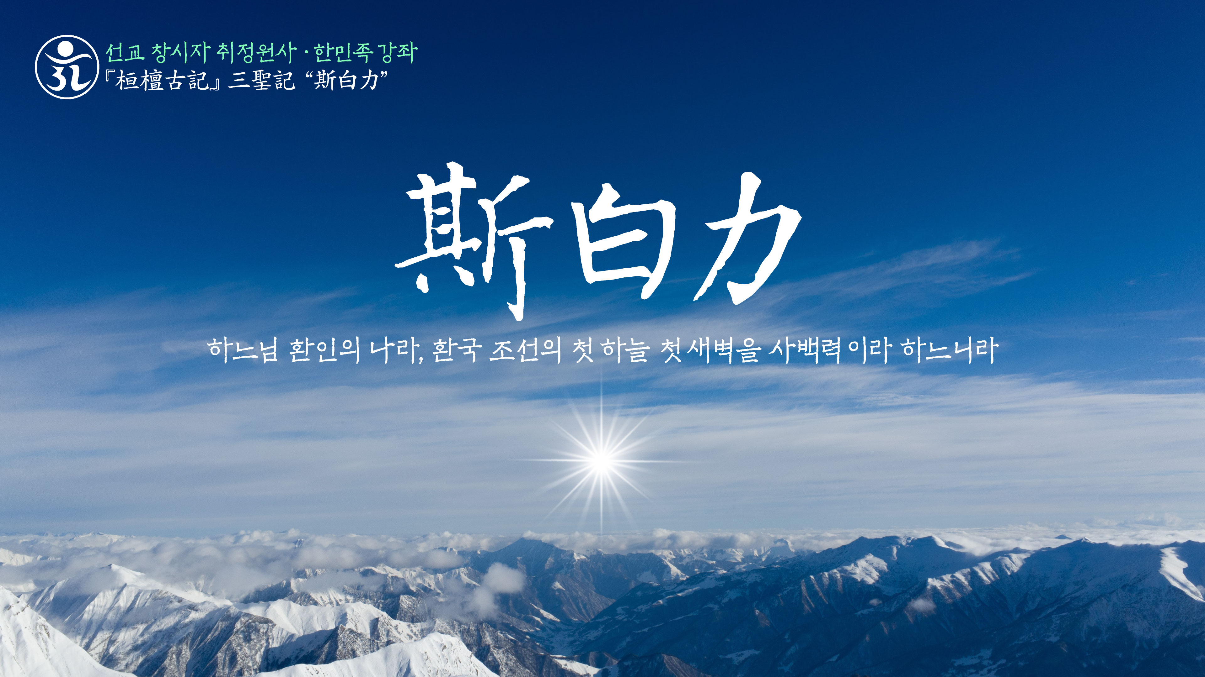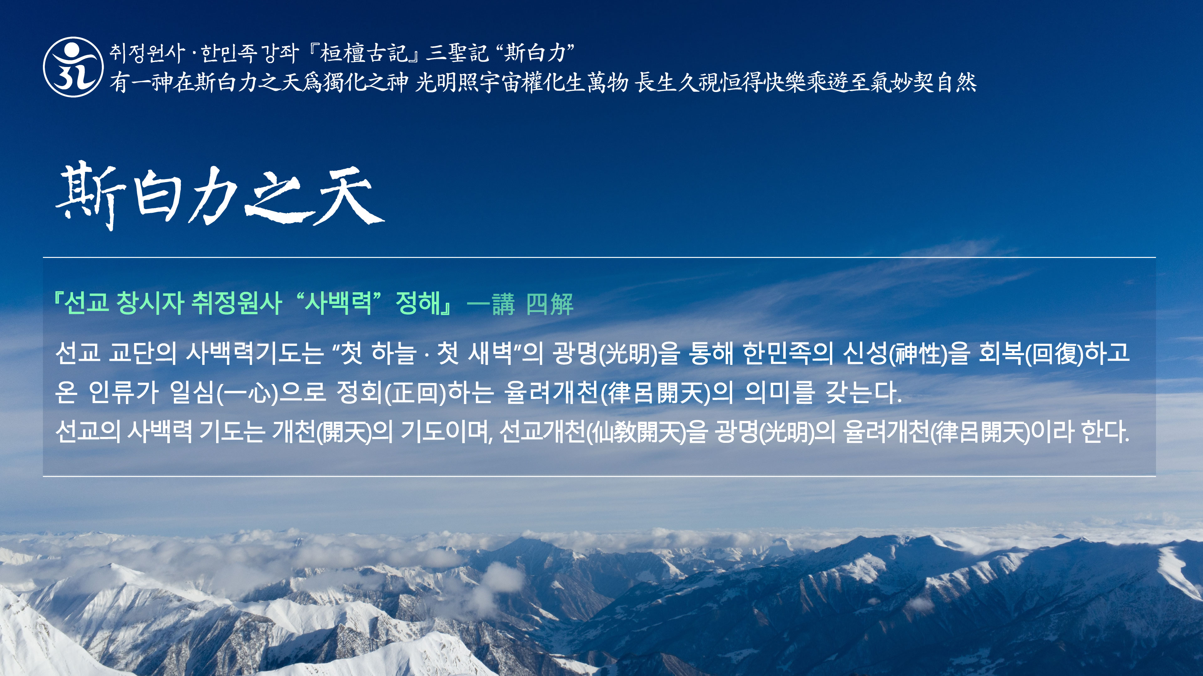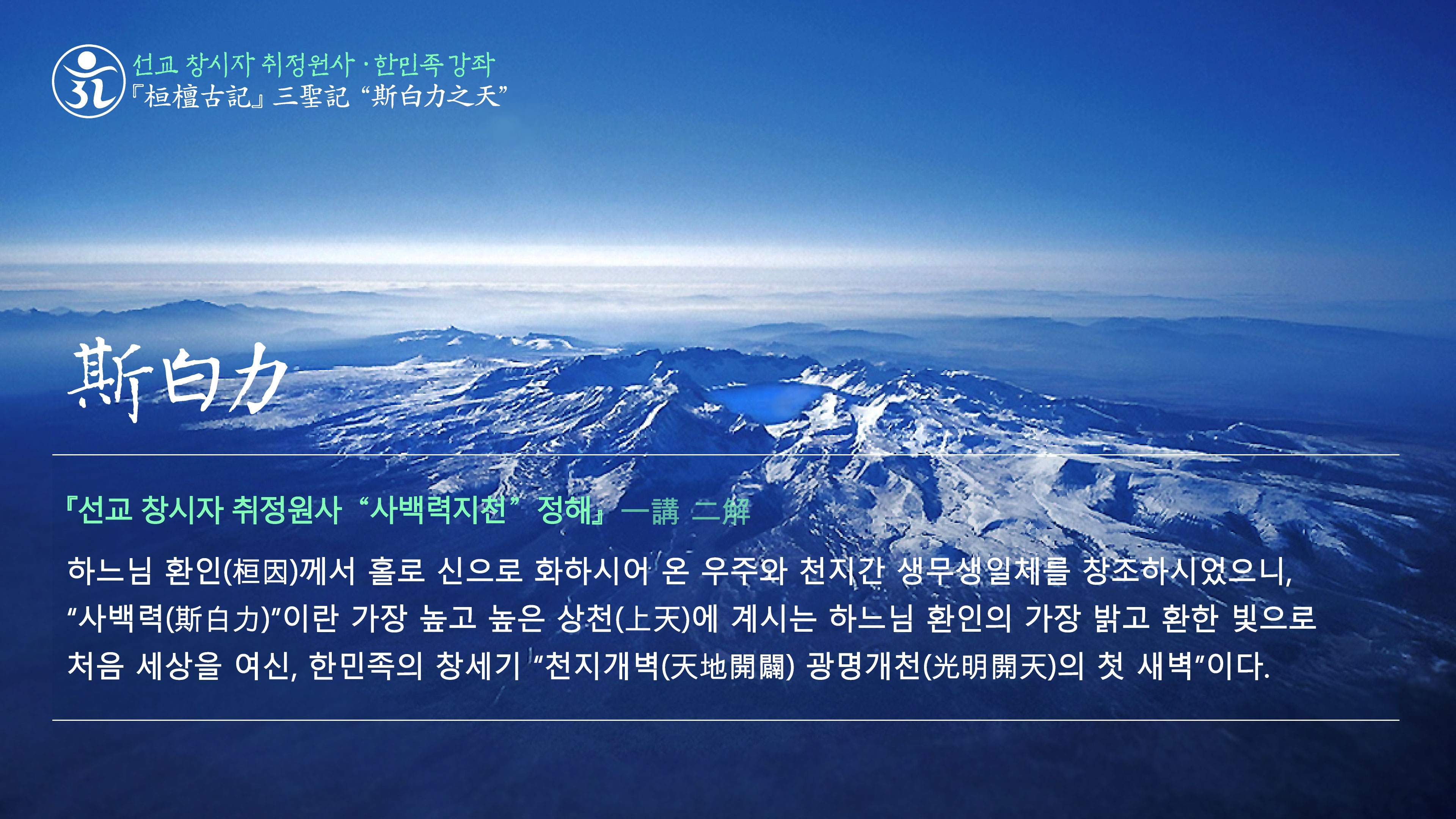 취정원사 한민족강좌 “광명사상” 有一神在斯白力之天爲獨化之神 光明照宇宙權化生萬物