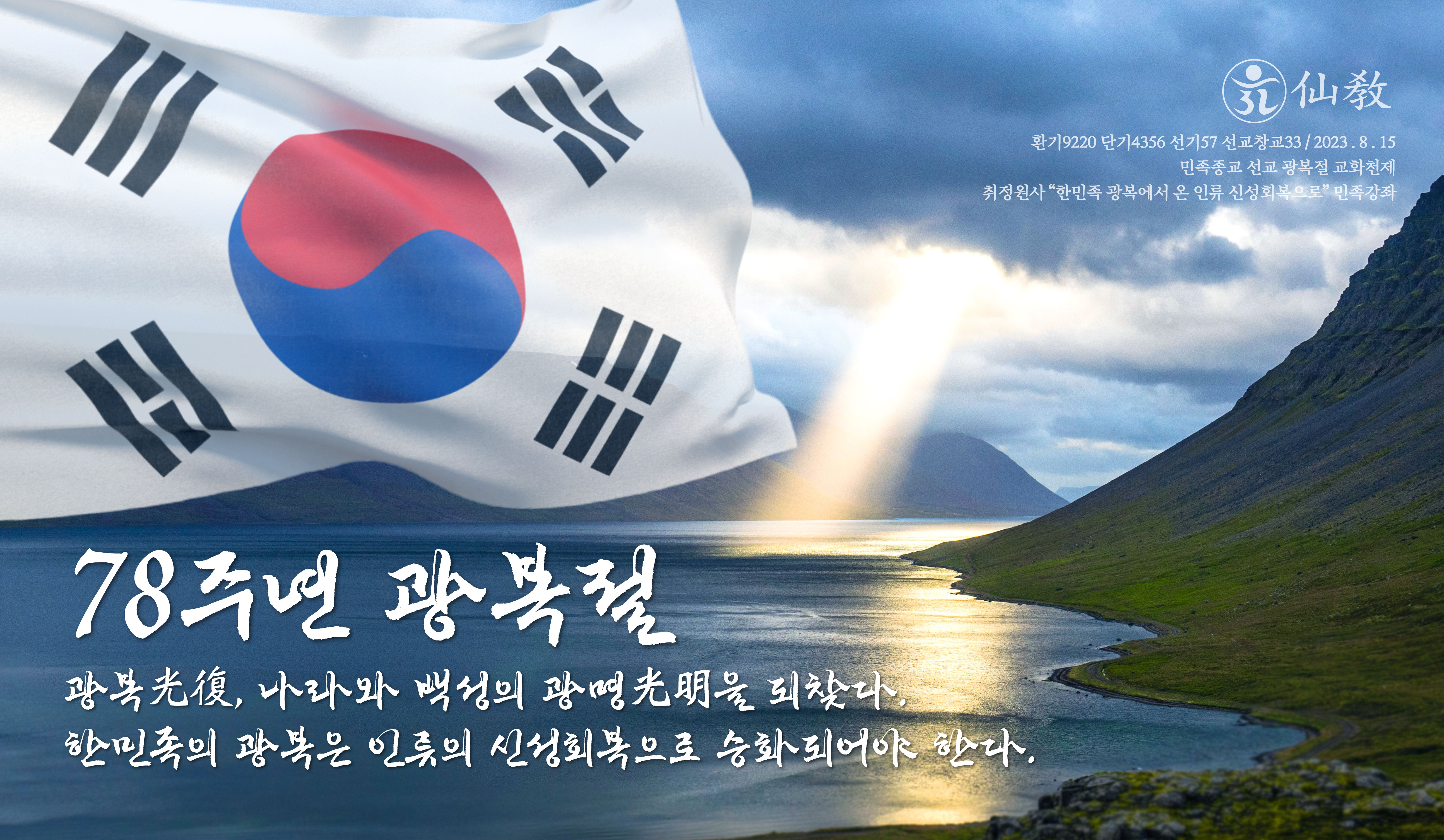 “78번째 광복절(光復節)을 맞은 오늘, 한민족의 광복(光復)은 주권회복(主權回復)의 의미에서 신성회복(神性回復)의 의미로 승화되어야 함을 생각합니다. ‘광복(光復)’은 우리나라의 주권을 되찾은 것이요, 나라의 주인인 만백성이 생명을 회복한 것입니다. 한민족의 생명(生命)은 하느님의 빛 광명(光明)에 있는 것이기에, 대한 조선(大韓朝鮮)의 광복(光復)은 생명의 빛을 되찾은 것이요, 하늘의 광명(光明)이 이 땅에 다시 빛나게 된 것입니다. 다시말하여 광복(光復)은 광명(光明)을 회복한 것입니다. 한민족은 하늘민족이요, 한민족의 나라 대한(大韓), 조선(朝鮮)의 주권(主權)은 하느님이 이 나라 만백성에게 부여하신 ‘광명(光明)’이요, 절대적인 ‘신성(神性)의 빛’ 입니다.”