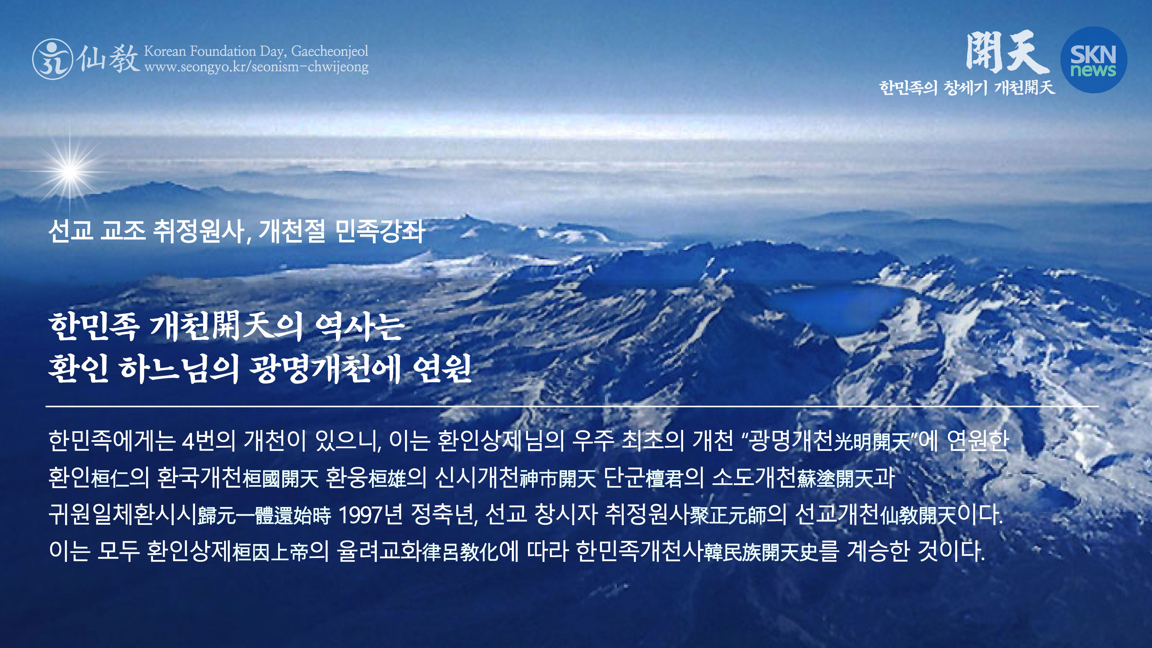 선교 창교주 취정원사, 개천절 맞아 “개천(開天), 한민족의 창세기” 천명 취정원사(聚正元師), “한민족의 창세기 개천(開天)과 창조주 환인(桓因)”주제로 민족강좌, “개천(開天)의 유래와