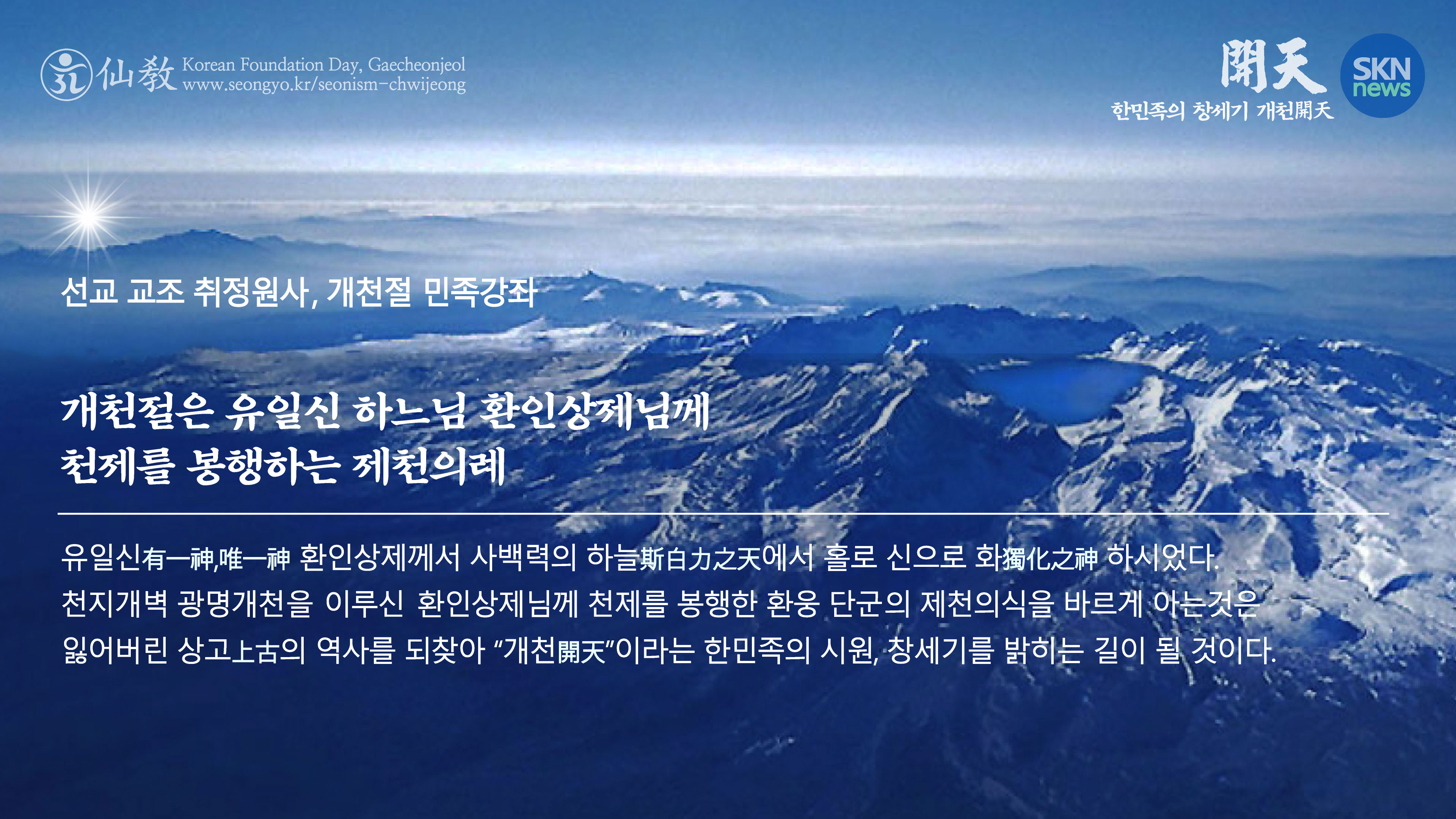 또한 “한민족의 시조이시며 온 세상의 하느님이신 환인(桓因) 께서는 사백력지천에서 우주의 첫빛으로 첫새벽을 열으시어 최초로 하늘을 열러 교화하시었으니, 이를 광명개천(光明開天)이라 한다. 그러하니 개천절(開天節)은 단군의 고조선 건국 또는 환웅의 신시 개천을 기념하는 것을 넘어, 한민족 개천사(開天史)의 뿌리를 찾고 연원을 밝히어, 개천(開天)은 한민족의 창세기임을 깨닫고 개천절에 기리는 대상은 하느님 환인(桓因) 이어야 함을 바르게 깨달아야 한다”고 설파하였습니다.