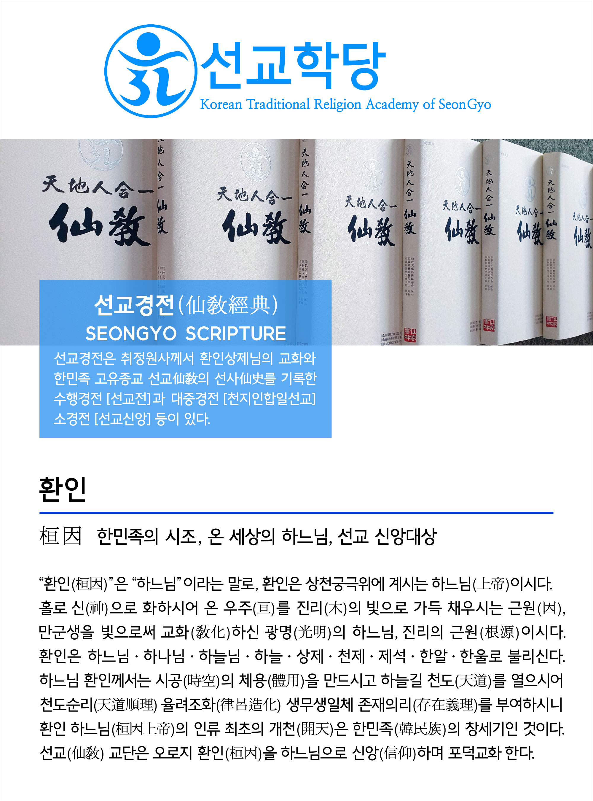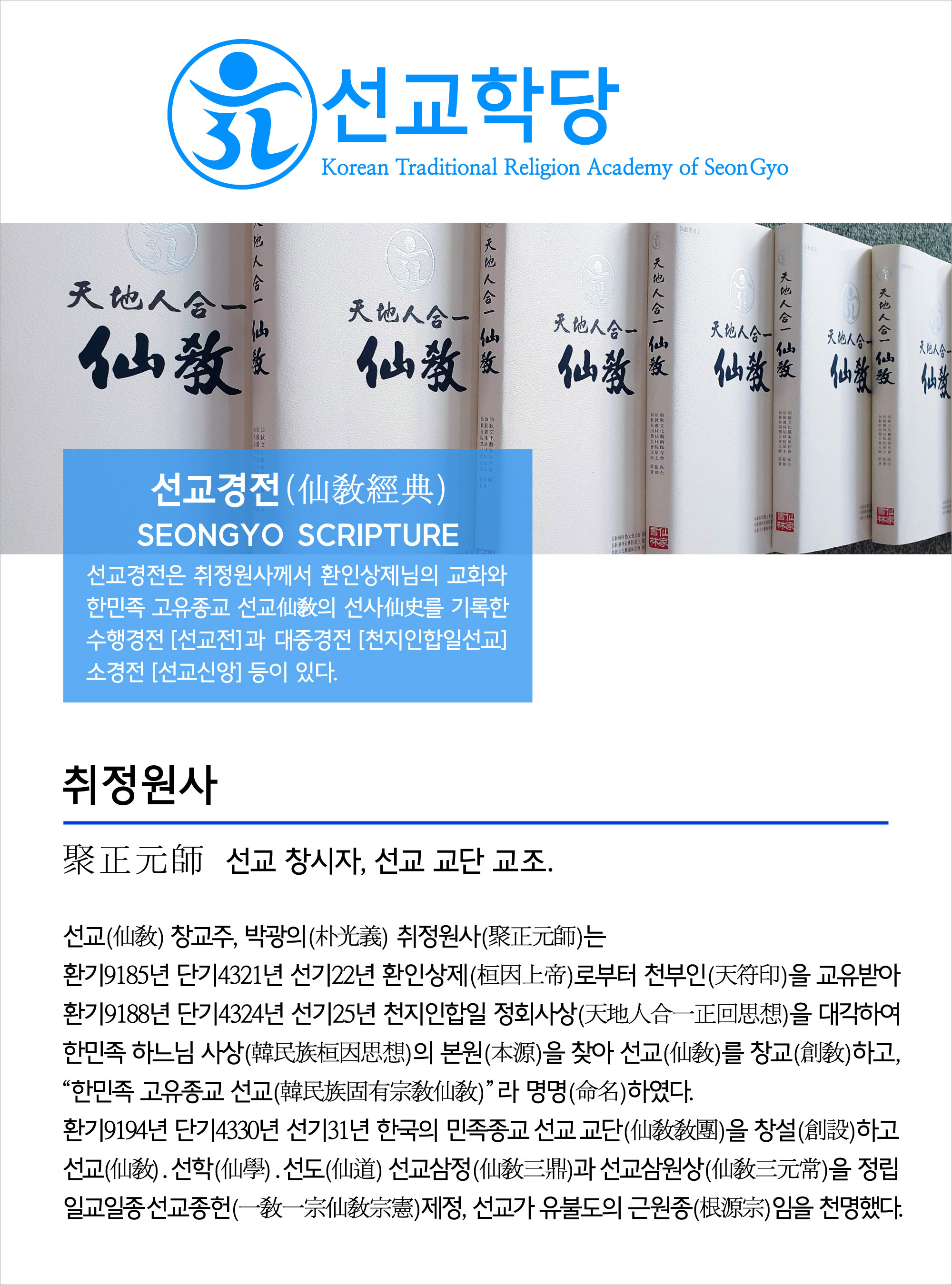 ※ 『仙敎典』 : 선교 경전. 한민족 고유종교 선교(仙敎)의 고유경전(固有經典). (1988~1997, 聚正元師 原著, 底本)