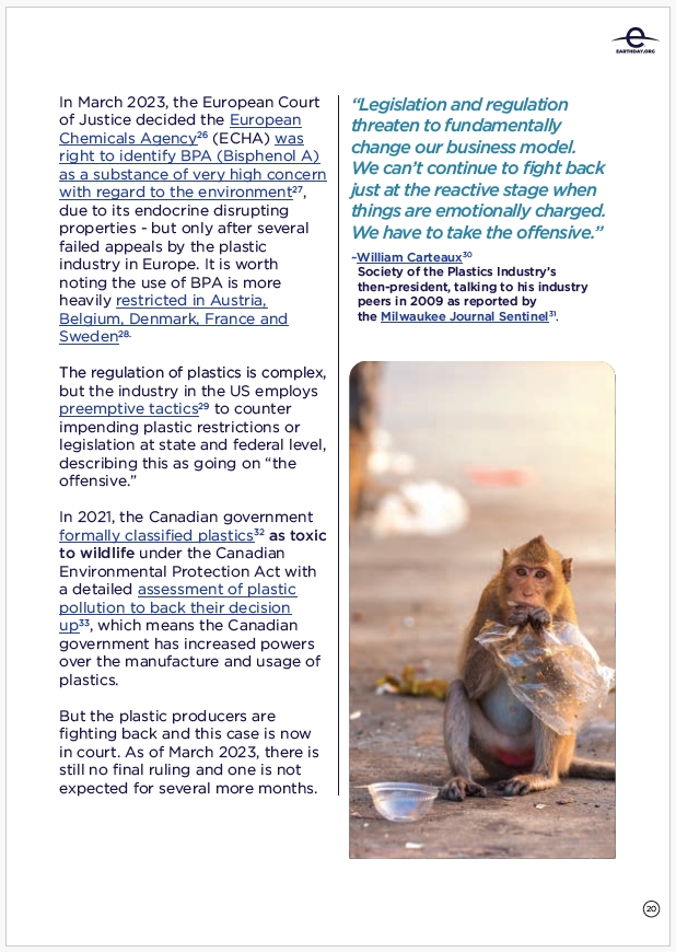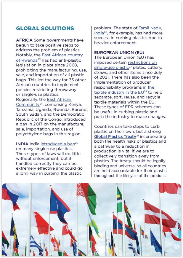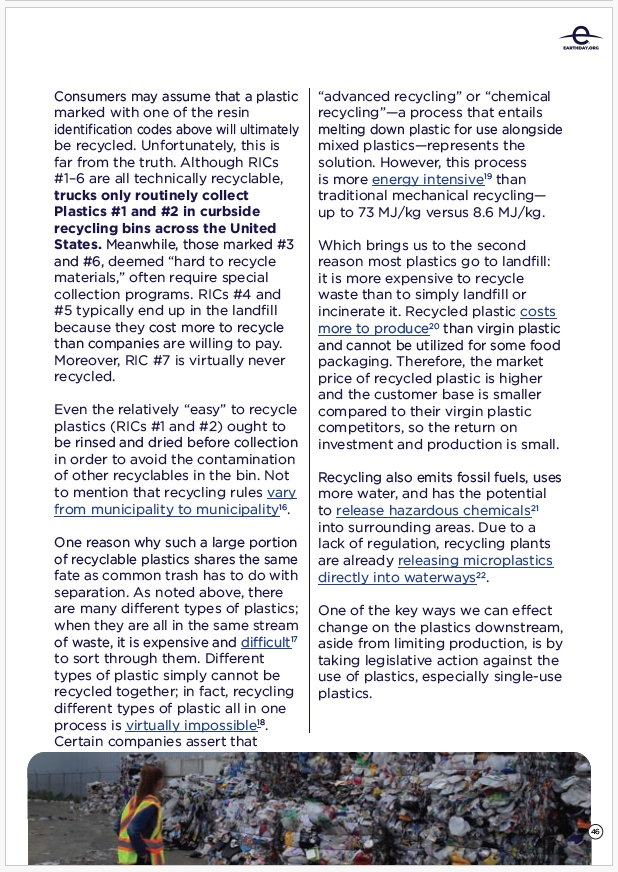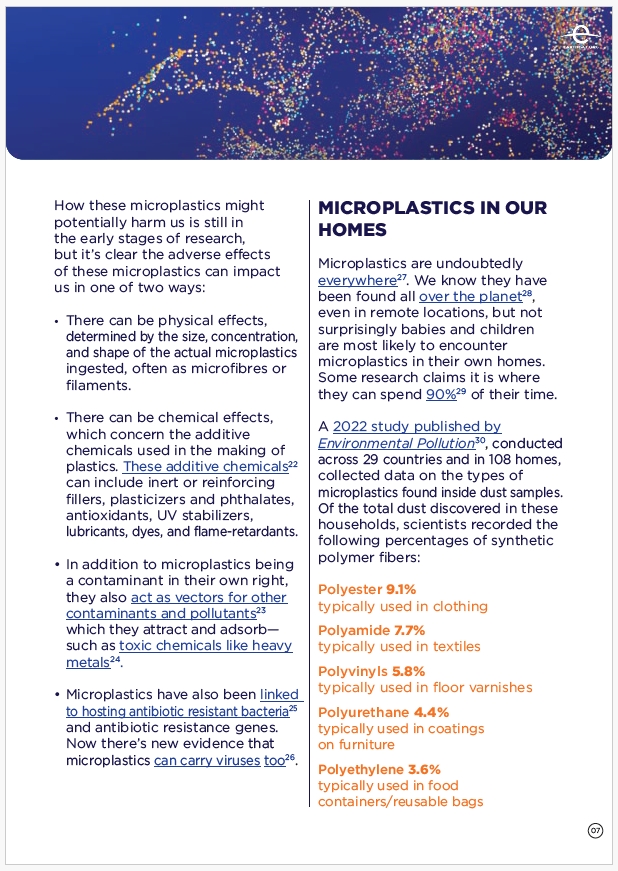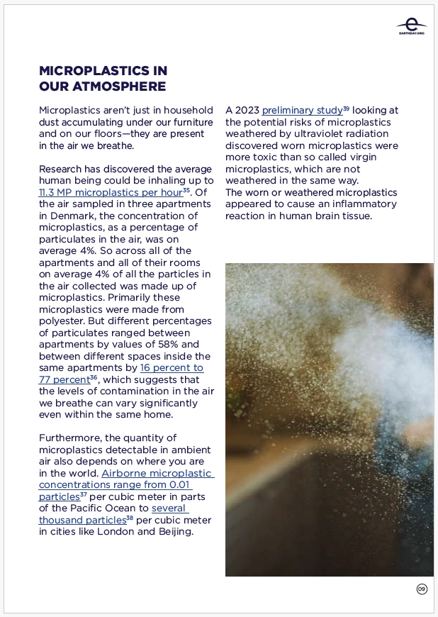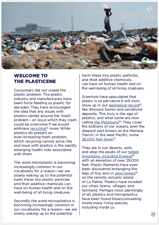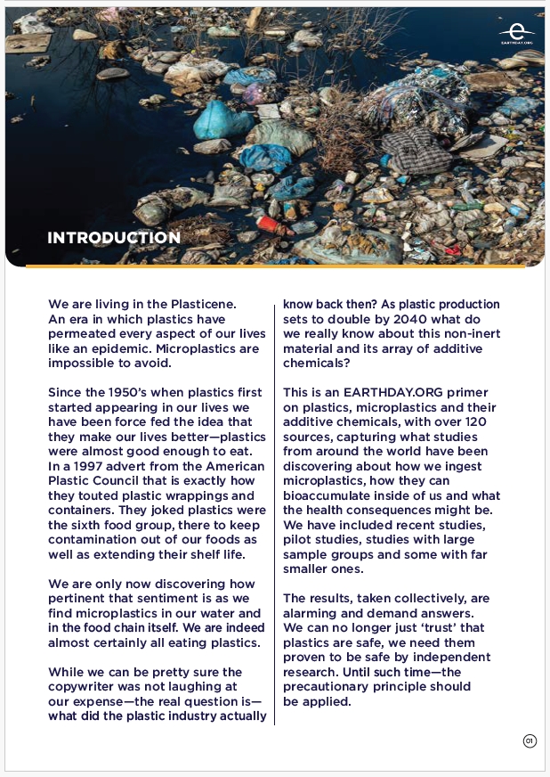 ▲ 우리는 플라스틱 안에서 살고 있습니다. 미세 플래스틱은 마치 피할 수없는 전염병처럼 우리 생활 곳곳에 스며들어 있어 가히 플래스틱 시대라 할 정도입니다. 플래스틱은 1950년대 처음 우리 앞에 등장했습니다. 우리는 플래스틱이 식생활에 아무런 해가 없으며 우리의 삶을 더 풍요롭게 만든다는 생각을 강요당했습니다. 1997년미국 플래스틱위원회의 플래스틱 포장용기의 광고가 그런방식입니다. 그들은 농담처럼 플래스틱이 여섯번째 음식 그룹이라고 했으며 플래스틱 용기에 음식을 보관할 경우 유통기한 연장도 가능하다고 말했습니다. 우리는 이제서야 물과 먹이사슬에서 미세플래스틱이 인체로 유입되는 방식을 발견했습니다. 우리는 실제로 거의 모든 플래스틱을 먹고있습니다. 우리의 진짜 문제는, 플라스틱 산업이 실제로 무엇을 했는가. 그것을 알고 있는가 하는 것입니다. 플라스틱 생산은 2040년까지 두 배로 증가할 예정입니다. 우리는 무엇을 해야 할까요. 우리는 이 강력한 물질과 그 화학첨가제에 대해서 정말로 알고 있을까요. 이것은 EARTHDAY.ORG의 플래스틱에 관한 입문서입니다. 전세계로부터 발견되어진 미세 플래스틱과 그 화학첨가물에 대한 섭취경로와 인체에 축척된 미세플래스틱이 건강에 미치는 영향에 관한 120개 이상의 소스와 캡처를 담고 있습니다. 우리는 거기에 최근연구, 파일럿 연구, 대규모 연구와 그보다 조금 작은 여러 연구를 포함시켰습니다. 그러한 연구들의 종합적인 결론은 심상치않은 경고와 답변을 요구합니다. 우리는 더이상 플래스틱이 안전하다는 것을 믿을 수 없습니다. 우리에게는 안전성이 입증된 독자적인 조사가 필요합니다.