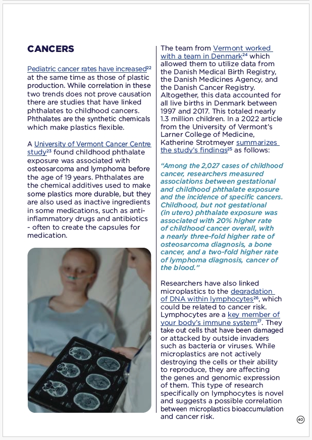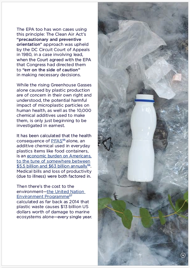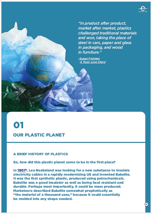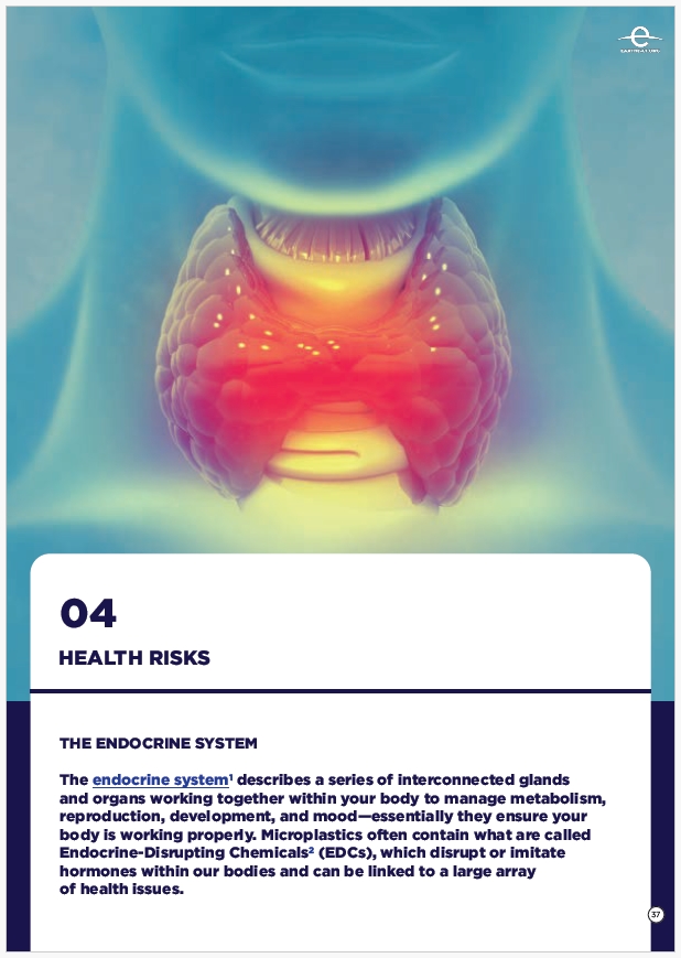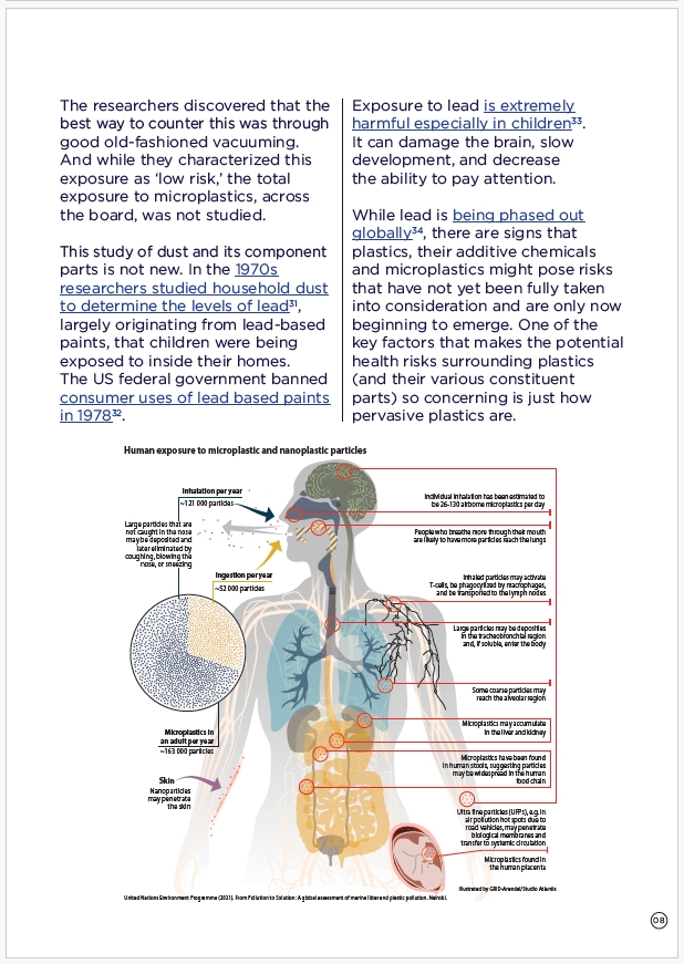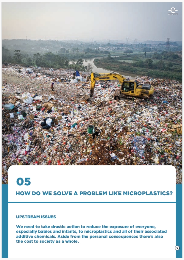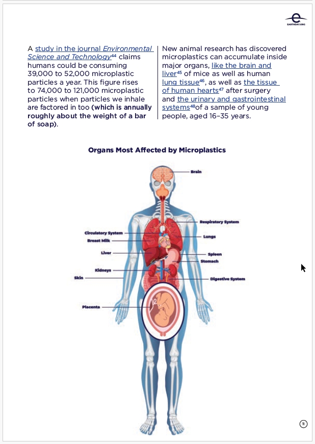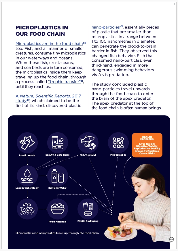 ▲ 우리는 플라스틱 안에서 살고 있습니다. 미세 플래스틱은 마치 피할 수없는 전염병처럼 우리 생활 곳곳에 스며들어 있어 가히 플래스틱 시대라 할 정도입니다. 플래스틱은 1950년대 처음 우리 앞에 등장했습니다. 우리는 플래스틱이 식생활에 아무런 해가 없으며 우리의 삶을 더 풍요롭게 만든다는 생각을 강요당했습니다. 1997년미국 플래스틱위원회의 플래스틱 포장용기의 광고가 그런방식입니다. 그들은 농담처럼 플래스틱이 여섯번째 음식 그룹이라고 했으며 플래스틱 용기에 음식을 보관할 경우 유통기한 연장도 가능하다고 말했습니다. 우리는 이제서야 물과 먹이사슬에서 미세플래스틱이 인체로 유입되는 방식을 발견했습니다. 우리는 실제로 거의 모든 플래스틱을 먹고있습니다. 우리의 진짜 문제는, 플라스틱 산업이 실제로 무엇을 했는가. 그것을 알고 있는가 하는 것입니다. 플라스틱 생산은 2040년까지 두 배로 증가할 예정입니다. 우리는 무엇을 해야 할까요. 우리는 이 강력한 물질과 그 화학첨가제에 대해서 정말로 알고 있을까요. 이것은 EARTHDAY.ORG의 플래스틱에 관한 입문서입니다. 전세계로부터 발견되어진 미세 플래스틱과 그 화학첨가물에 대한 섭취경로와 인체에 축척된 미세플래스틱이 건강에 미치는 영향에 관한 120개 이상의 소스와 캡처를 담고 있습니다. 우리는 거기에 최근연구, 파일럿 연구, 대규모 연구와 그보다 조금 작은 여러 연구를 포함시켰습니다. 그러한 연구들의 종합적인 결론은 심상치않은 경고와 답변을 요구합니다. 우리는 더이상 플래스틱이 안전하다는 것을 믿을 수 없습니다. 우리에게는 안전성이 입증된 독자적인 조사가 필요합니다.