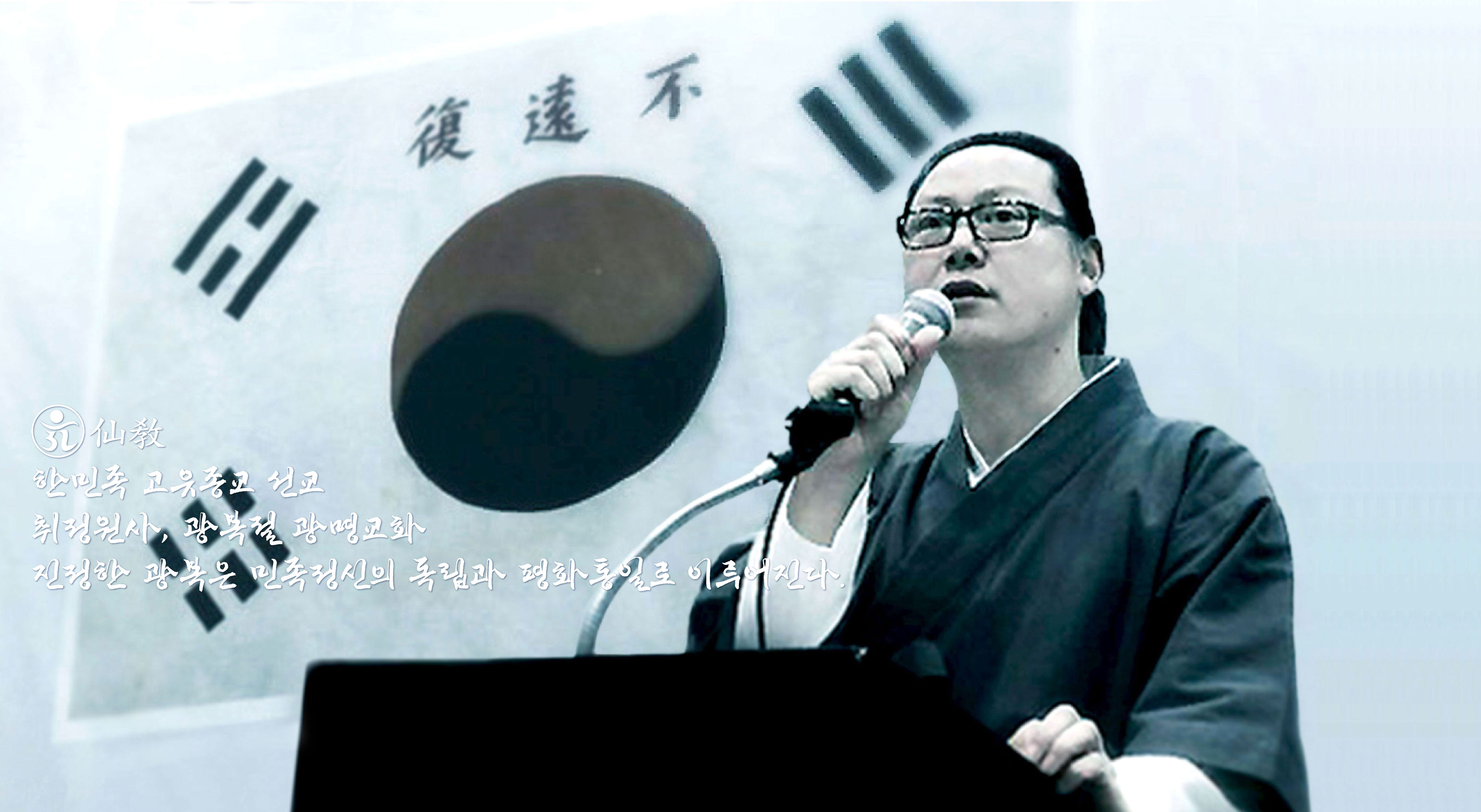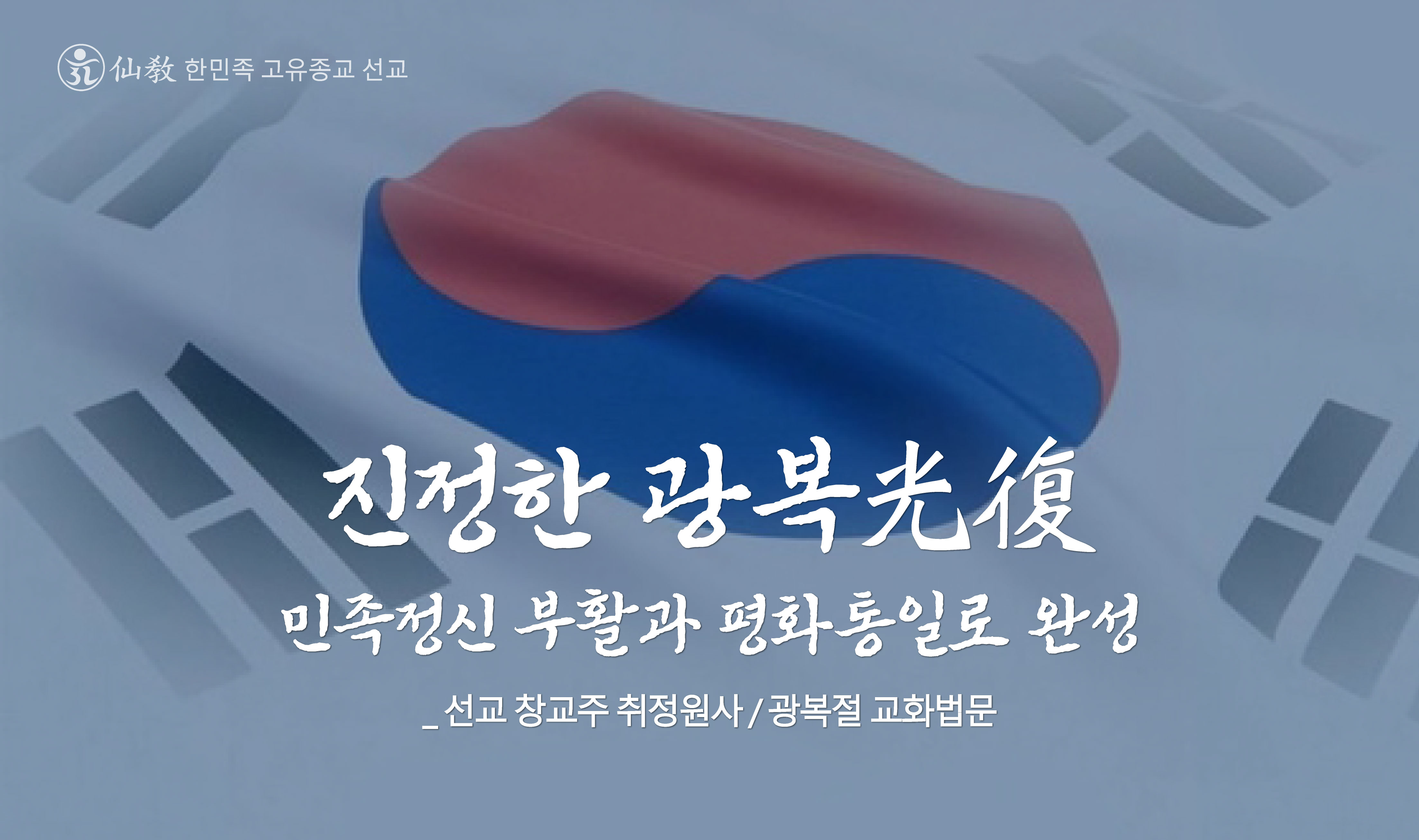 79주년 광복절(光復節)을 맞은 오늘, 선제선도(仙弟仙徒) 모든 선교인(仙敎人)이 청정수행(淸淨修行)으로 천지인합일(天地人合一) 천부인(天符印)의 진리를 깨달아 신성(神性)을 회복(回復)하고, 진리의 인간 ‘선인(仙人)’으로 거듭남으로써, 진정한 광복(光復)을 이끌어가기를 희망합니다. 나아가 온 인류를 신성의 빛(光明)이 충만한 천지인합일 정회세상(天地人合一正回世上)으로 인도하는, 한민족의 온전(穩全)한 광복(光復)을 일심(一心)으로 기원(祈願)합니다.