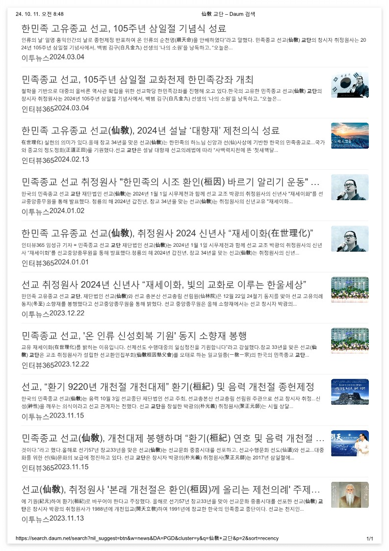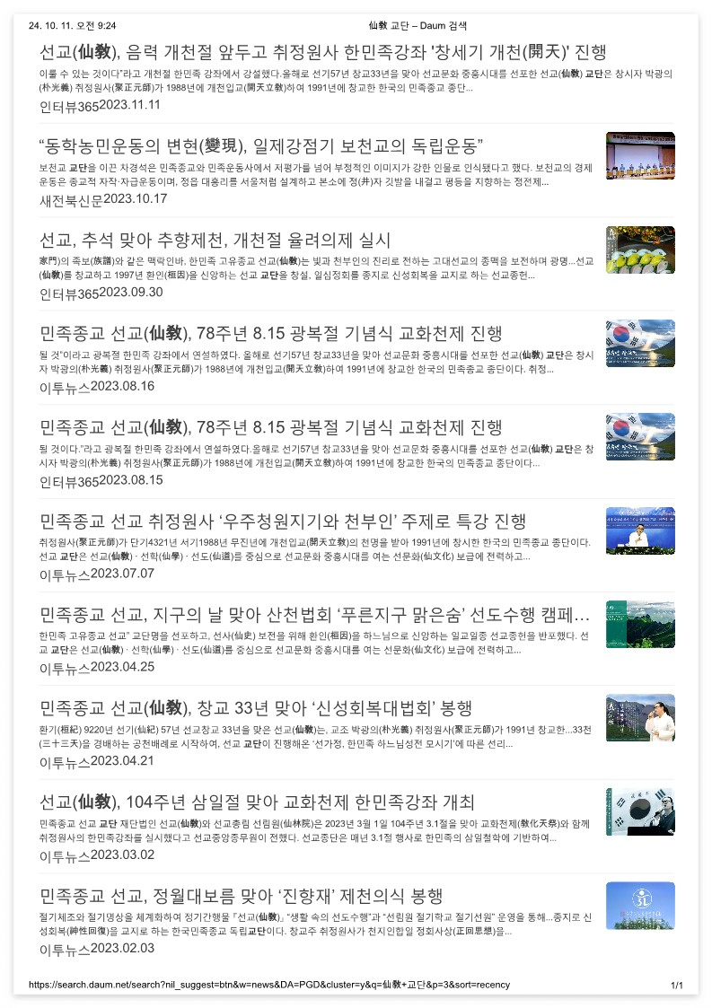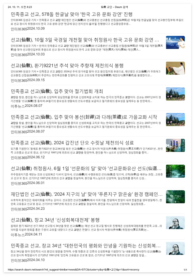 *다음(Daum) 뉴스를 중심으로 확인된 “선교(仙敎) 교단” 종사(宗史) _ (2024.10.11 기준)