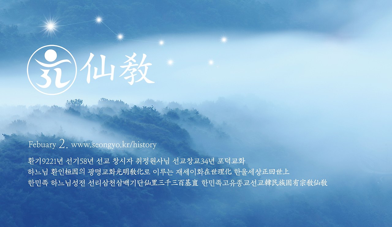 | 선교창교33주년 "2월, 선도수행의 달" 한민족고유종교선교 포덕교화 / 2024 재단법인 선교 설날 대향재, 정월초이레 청룡제신재, 순천일 율려개천, 정월대보름 진향재, 입춘치성, 선교 창교주 취정원사 仙문화 강연, 음력2월 선정 |