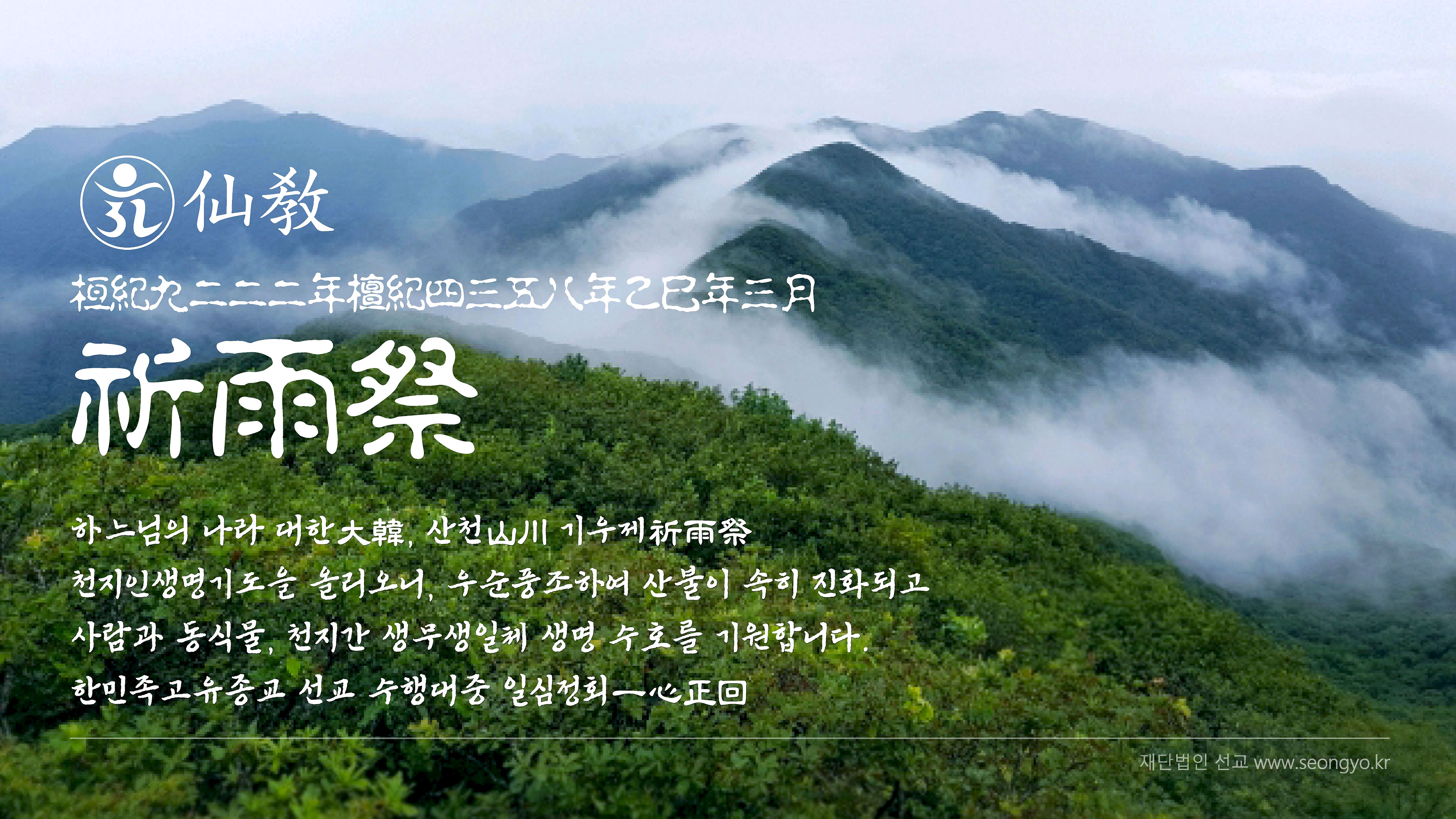 [선교중앙종무원] 한민족 고유종교 선교종단 재단법인 선교(仙敎)와 선교총본산 선교총림 선림원은 3월 31일(음력 3월 3일) 선교창교 34주년 창교절을 앞두고, “기우제(祈雨祭)”로 조속한 산불진화와 생명수호를 기원하고, 이어 천지인생명기도(天地人生命祈禱)를 실시합니다. 선교 수행대중은 선교 창교절 율려의제 기간 중의 기우제와 생명기도로 선교창교절 생무생일체 신성회복(生無生一切神性回復) “소선(蘇宣)”의 의미를 되살리는 대중교화에 힘써야 할것입니다.