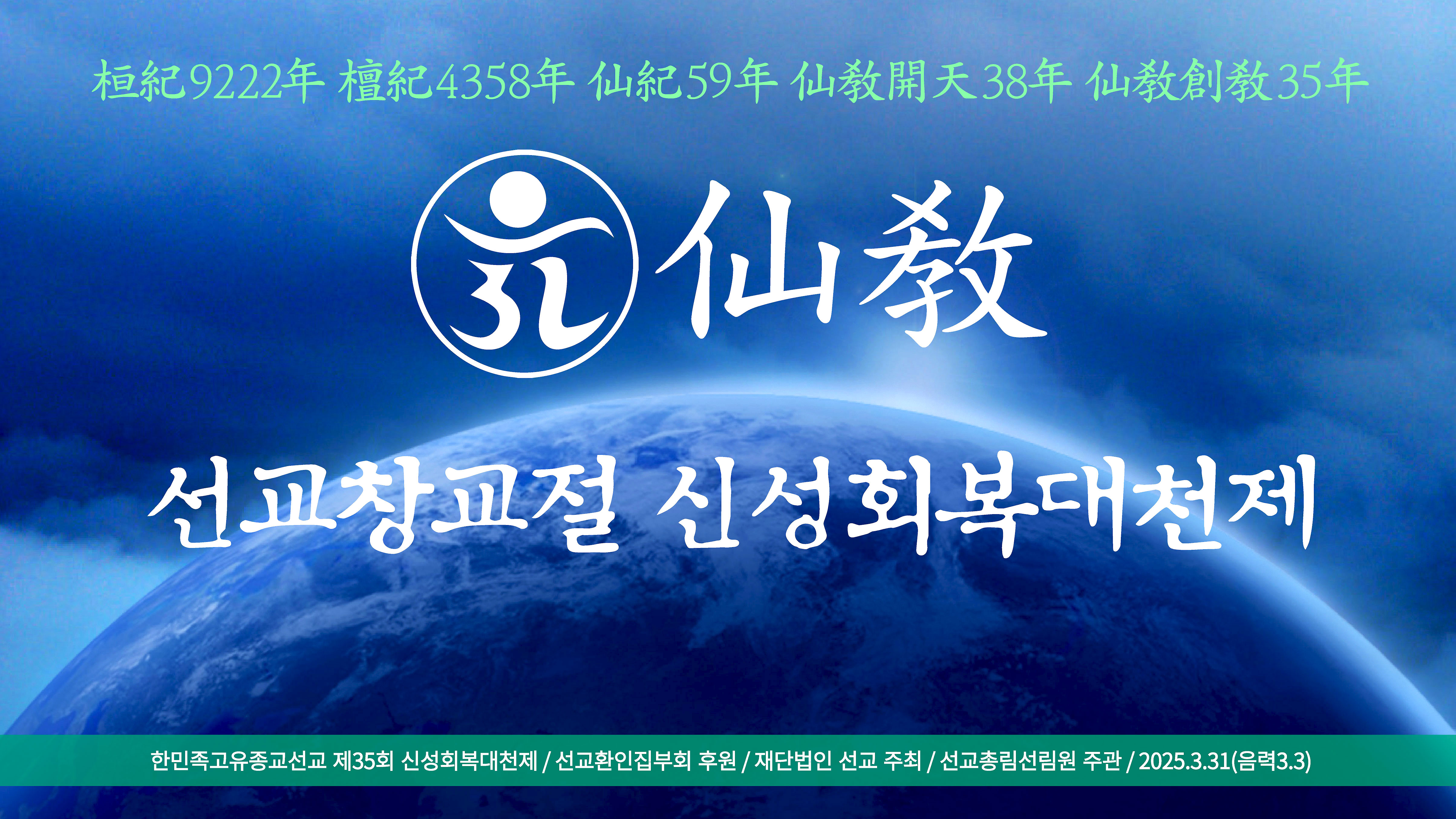 선교종단 재단법인 선교(仙敎)는 선교환인집부회(仙敎桓因慹父會) 후원 · 선교총림 선림원(仙林院) 주관으로 음력 3월 3일 선교창교일에 “선교 창교 34주년 신성회복대천제(神性回復大天祭)”를 봉행했습니다.