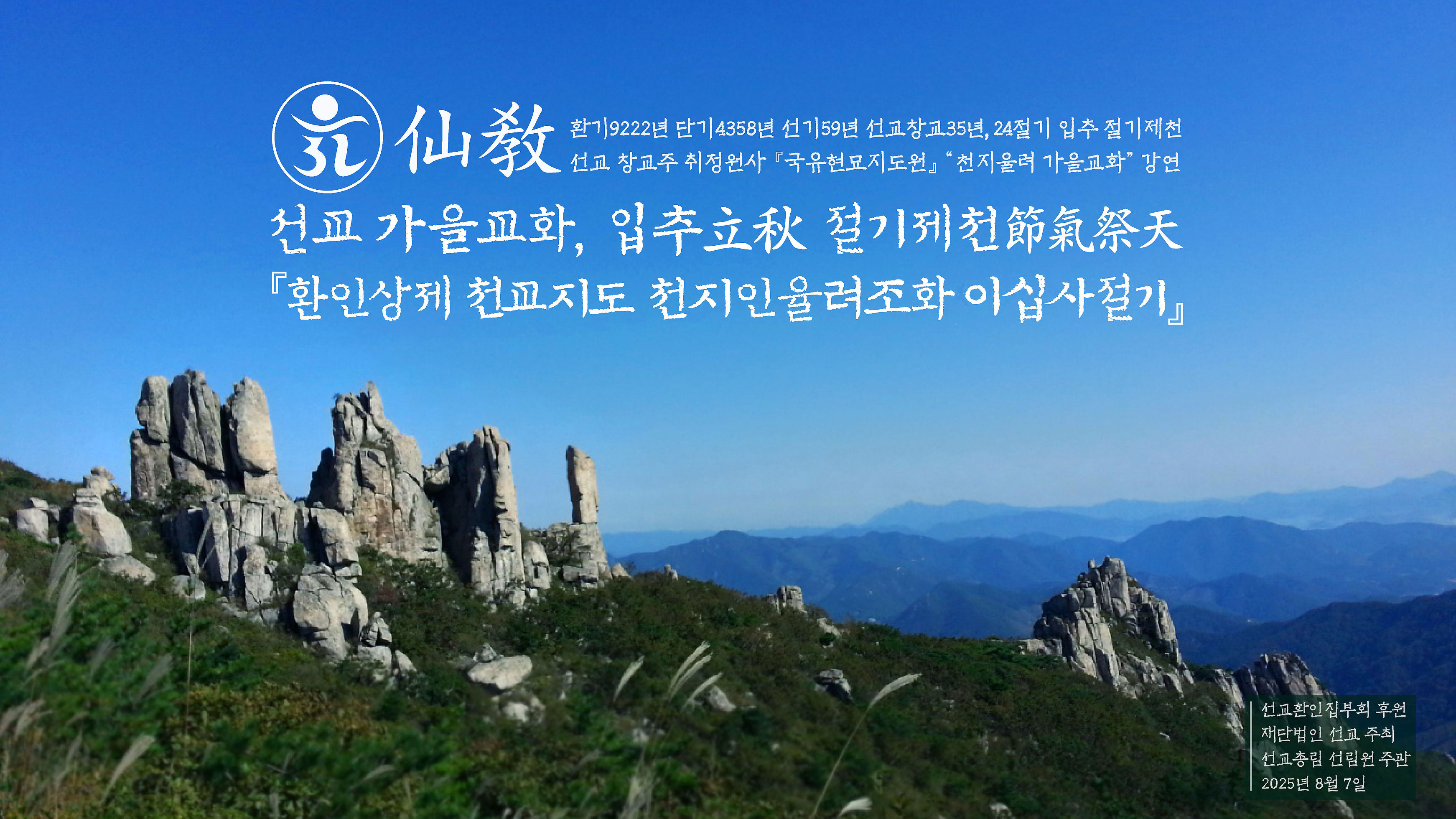 “절기제천(節氣祭天)”은 선교(仙敎) 교단의 고유한 제천의식으로, 2025년 입추 절기제천은 선교경전 선교전(仙敎典)에 실린 취정원사의 절기교유 《환인상제천교지도 천지인율려조화이십사절기(桓因上帝天敎指道 天地人律呂造化二十四節氣)》를 공개하고, 열세번째 절기인 “입추(立秋)”가 ‘가을교화의 시작이자 정회(正回)의 순환점’임을 알리는 동시에 우리나라가 24절기 하늘교화 펼쳐지는 절기문화 종주국임을 인식하는 자리로 기획되었습니다.