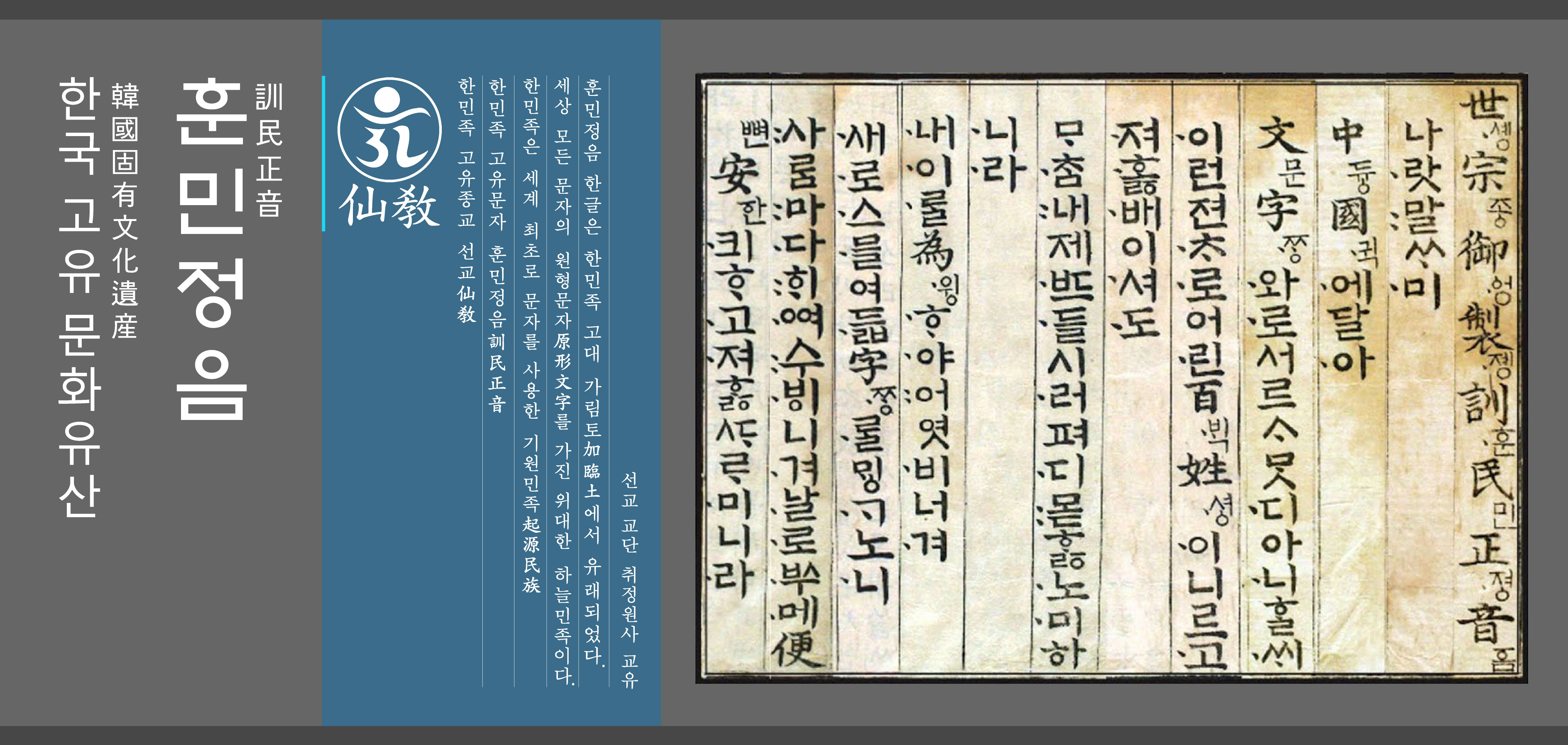 한민족은 환인(桓因) 하느님의 직계자손인 하늘민족이요, 한민족의 문화는 하늘문명에서 태동하였다. 한민족 고유문화는 하늘문명에서 비롯되었으니, 한민족의 문화에는 환인(桓因) 하느님께서 세상을 창조하시고 교화하시는 천지인(天地人) 율려조화(律呂造化)의 이치가 담겨 있다. ○ 한글의 소리와 형상은 하느님 환인(桓因)의 교화, 천지인(天地人) 율려(律呂)의 이치와 조화에 따라 만들어진 것이다.문자(文字) 또한 예외는 아니어서 우리 한글의 소리와 형상은 하느님 환인(桓因)의 교화, 천지인(天地人) 율려(律呂)의 이치와 조화에 따라 만들어진 것이다. 사람 또한 천지인(天地人)의 조화(造化)로 생겨난 것이므로 사람이 읽고 쓰는 문자는 근본적으로 천지인(天地人)의 율려조화(律呂造化)에 따른 소리이고 형상이어야 함이 마땅한 일이다. ○ 한글 자음(子音)과 모음(母音)의 조화는 우주천지만물의 형이상학적(形而上學的)이고 형이하학적(形而下學的)인 모든 표현을 가능하게 한다. 한글은 세계 거의 모든 소리(音韻)와 언어(言語)를 기록할 수 있으며, 훈민정음의 28자, 더 나아가 가림토의 38글자로 소급한다면 그 범위는 더욱 늘어난다. ○ 유네스코(UNESCO)는 1989년에 '세종대왕상(King Sejong Literacy Prize)’ 제정하였다.한글의 뛰어남은 이미 세계가 함께 인정하는 바이다. 우리의 한글은 학습이 용이하여 세계 문맹 퇴치에 크게 기여하고 있으며, 그 기여도를 인정한 유네스코는 1989년에 세종대왕상(King Sejong Literacy Prize)’을 제정하기도 하였다. 우리의 한글이 세계문화유산에 선정되어 국제적인 위상을 세우게 된것이다. ○ 또한 한글은 종이문서의 디지털화에도 뛰어난 적합성을 보여주고 있다. 한글의 이러한 편리성과 범용성 역시 천지인(天地人)의 원리(原理)에서 나온 것으로, 실례로 천지인의 원리를 이용한 휴대폰 키보드가 개발되어 지금도 편리하게 사용되고 있다. ○ 한글의 소리와 문자에는 천지인합일의 진리가 담겨 있으니, 한국어(韓國語)를 사용할 때마다 한글의 자음모음에 담긴 천지인 사상(天地人思想)에서 비롯된 진리(眞理)의 진동(振動)이 우리를 각성시키고, 우주천지만물에 깃든 하느님 환인의 하늘교화 천지인합일(天地人合一) 율려조화(律呂造化)의 근본원리와 이치가 우리와 함께 한다. 한민족은 하늘의 진리로 말하고, 진리로 교화하는, 진리의 인간인 것이다. ○ 진리의 인간 ‘하늘민족 한민족(韓民族)’은, 온 인류의 신성(神性)을 회복하고, 더 나아가 지구자연과 우주천지의 신성회복(神性回復)까지 안배하는 천지인합일 대동개천 한울세상을 실현할 사명을 가진다. ○ 하늘민족 한민족이여! 하늘문명을 간직한 진리의 민족이여! 스스로에 잠재된 하느님 환인(桓因)의 씨앗 인(因)을 싹틔워 신성(神性)을 회복하고, 진리의 인간 신단수(神壇樹)로 자라나 온 세상 인류구원의 정회사명(正回使命)을 완수하라. 이 땅에 환인(桓因) 하느님의 율려조화가 펼쳐지는 대동개천 한울세상 실현하여 재세이화(在世理化) 하라!
