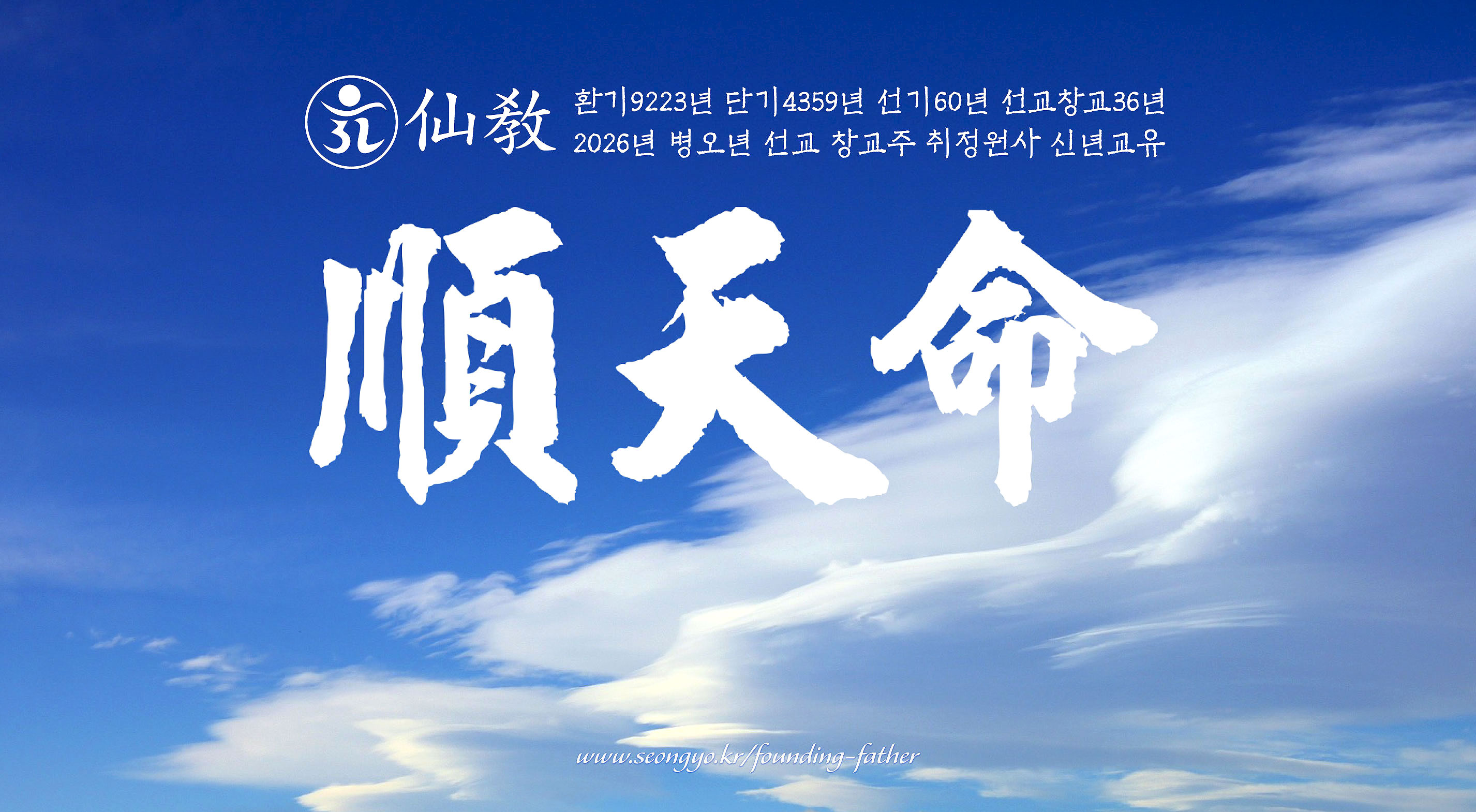 “환기9223년 단기4359년 선기60년 2026년 병오년(丙午年)의 새해가 밝았다. ○ 병오년(丙午年)은 60년(六十年) 1주기(一週期)를 완성하는 ‘선기 60년(仙紀六十年)’의 해이며, 12년(十二年)의 개천(開天) 주기가 삼태극(三太極)으로 회전(回轉)하여 천지인의 개천(天地人開天)을 완성하는 ‘선교창교 36년(仙敎創敎三十六年)’의 해이다. ○ ‘선교 기원 60년(仙敎紀元六十年)’과 ‘선교 창교 36년(仙敎創敎三十六年)’은 각각 일심정회(一心正回)와 천지인 대동개천(天地人大同開天)을 상징한다. ○ 사람의 나이 50세(五十歲)를 지천명(知天命)이라 한다. 우주 천지만물이 진리의 근원으로 정회(正回)하는 귀원일체환시시(歸元一體還始時), 우주의 가을에 창교된 선교(仙敎) 교단(敎團)은 이제 선기(仙紀) 60년을 맞아 하늘의 뜻을 깨닫는 지천명(知天命)의 단계를 넘어 하늘의 뜻에 따라 신성교화(神性敎化)를 펼치는 순천명(順天命) 시대에 접어들었다. ○ 순천명(順天命) 시대의 선교(仙敎)는 ‘신성의 빛’으로 온 세상을 밝히는 대광명(大光明)의 ‘가을교화’를 펼치며 인류와 지구자연 나아가 우주의 신성회복(神性回復)과 생무생일체 온 인류구원의 정회사명(正回使命)을 실천한다. ○ 즉 한민족의 고유한 종교 선교(仙敎)는 순천명(順天命)으로써 하늘의 뜻이 이 땅에 이루어지는 홍익인간(弘益人間) 재세이화(在世理化)를 실현한다. ○ 순천자존(順天者存) 역천자망(逆天者亡)이라 하였다. 한알의 신성(神性)에서 비롯되어 한울을 이루는 생무생일체(生無生一切)가 진리의 근원인 환인(桓因) 하느님(天帝)의 일심(一心)으로 바르게 돌아가는 것이 선교의 종지(仙敎宗旨) 일심정회(一心正回)이다. ○ 그러하니 순천명(順天命)하여 일심정회(一心正回)하는 순천자(順天者)는 진리(眞理)와 함께 영원할 것이요, 역천자(逆天者) 사도(邪道)의 무리는 필망(必亡)할 것이다. ○ 선가(仙家)의 선제선도(仙弟仙徒) 수행대중(修行大衆) 선교인(仙敎人) 모두는 공익을 위한 포덕교화의 입장에서 유사선교단체를 계도하여 선량한 선보선제를 보호해야 한다. 선교 교단의 교단명칭을 참칭하고 창교의 업적과 교리를 도용하여 혹세무민하는 유사선교와 역천의 무리를 정도(正道)로써 계도하고 신성(神性)으로 교화하여 정회(正回)의 길로 영도(領導)해야 하는 것이다. ○ 순천명(順天命)한다는 것은 내 안에 하늘님 환인(桓因)께서 부여하신 빛의 씨앗 ‘신성(神性)’이 있음을 깨달아 신성을 회복하고 하늘뜻에 순응(順應)하는 것이다. 이것이 진리로써 하나되는 천인합일(天人合一)이요, 천지인의 대동개천(天地人大同開天)이다. ○ 생무생일체 온 인류는 한하늘 아래 한자손이요, 하느님 환인의 광명(光明)을 따르는 빛의 사람이며, 천리(天理)에 순응하는 수행자이다. ○ 우리의 마음가짐뿐만 아니라, 이념과 사상, 법도와 행동규범에 이르기까지 하늘의 이치에 따르는 것이 순천명이요, 선교의 천도순리(天道順理)인 것이다. ○ 정치와 종교가 솔선하여 사욕(私慾)과 사도(邪道)를 버리고 겸허히 천명(天命)에 따라 정도정회(正道正回) 할 때, 나와 내 가족을 구원하고, 이웃과 사회, 나라와 민족, 나아가 온 인류를 구원하는 ‘순천명(順天命)의 시대’가 열린다. ○ 청정수행(淸淨修行)과 대동(大同)의 이타적(利他的) 포덕(布德)으로 인류평화공존(人類平和共存)의 순천명(順天命)을 실천하라.”