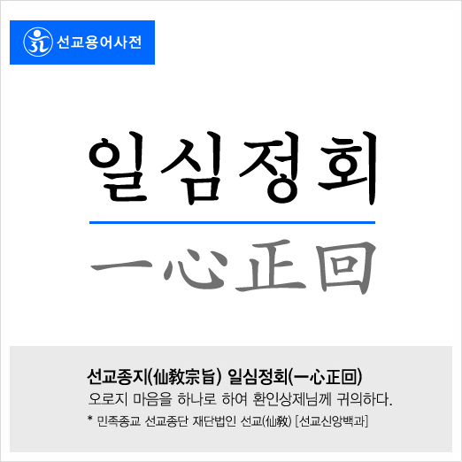 일심정회 一心正回“일심정회(一心正回)”는 선교(仙敎)의 종지(宗旨)이다. 선교 창시자 취정원사(聚正元師)의 선교창교종리(仙敎創敎宗理) 「천지인합일 정회사상(天地人合一思想)」이 집약