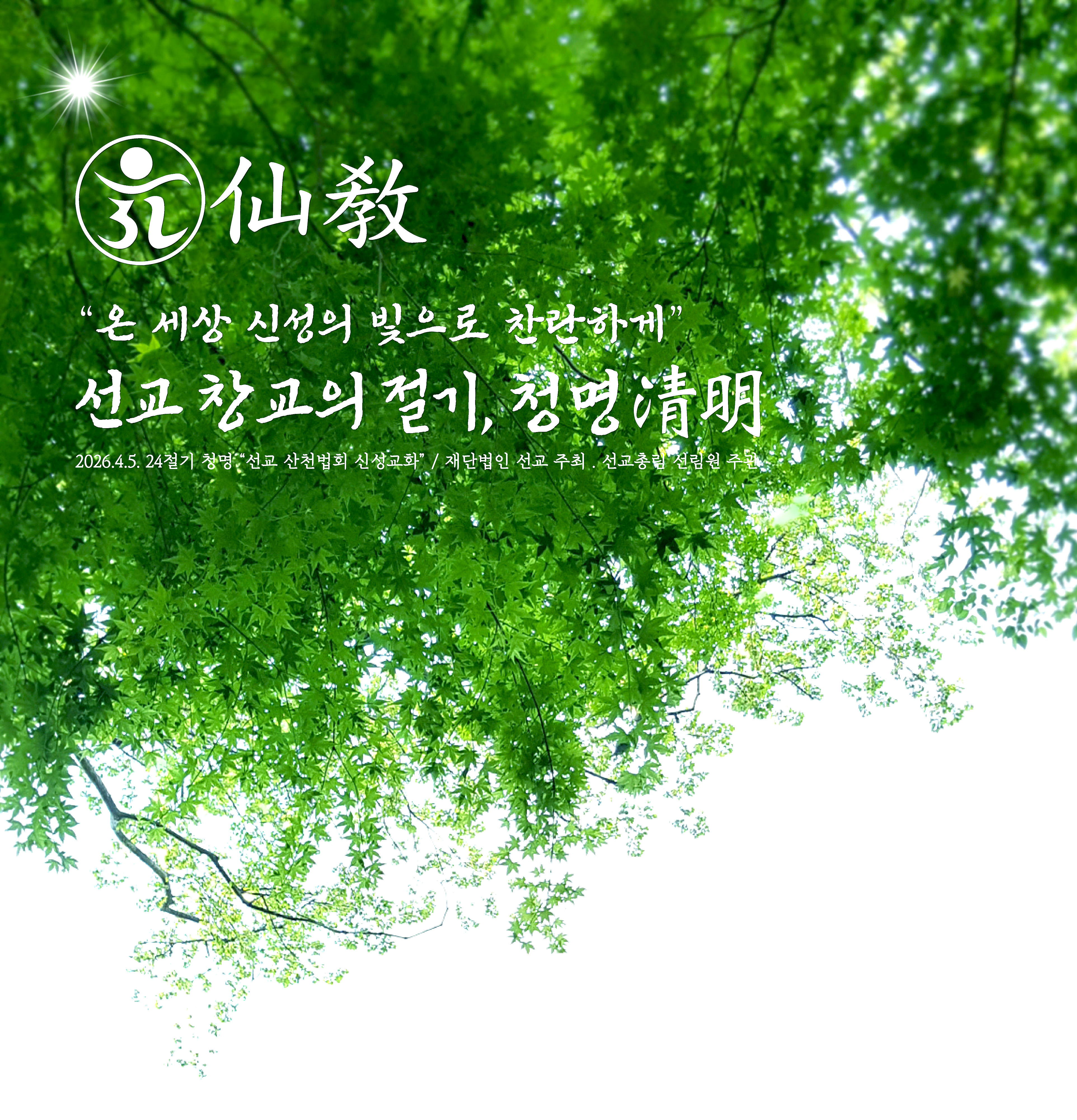 “선교(仙敎 창교의 절기 청명(淸明)을 맞아, 선제전도 선교수행대중 선교인(仙敎人)에 교유하느니, 한민족 고유의 하느님신앙을 부활한 한민족 고유종교(韓民族固有宗敎) 선교(仙敎)의 창교는 일심(一心)으로의 정회(正回)요, 신성(神性)의 회복(回復)이며, 한민족의 시조이시며 온 세상의 하느님이신 환인 상제님의 광명개천을 게승하여 신성의 빛 신성광명으로 천지인(天地人)의 개천(開天)을 안배한 선교의 율려개천(律呂開天)임을 천명합니다. ○ 청명지절에 찬란하게 빛나는 신성광명(神性光明)은 내 안에 잠재된 하늘의 성품인 일심신성(一心神性)을 회복하고 신성의 꽃의 피워 선교문화 중흥시대를 열어가는 환인하느님 본연(本然)의 광명(光明), 근원적 진리의 빛입니다. ○ 신성회복을 회복하는 것은 개천(開天)을 창세기로 하는 환인하느님(桓因上帝)의 자손, 한민족 한국인 모두의 정회사명(韓民族正回使命)입니다. ○ 선교경전『선교전(仙敎典)』선교창교편(仙敎創敎篇)에 이르기를, ‘선교 창교의 절기 청명(淸明)은 하늘이 맑고 햇빛이 선명하여 온 세상이 새 빛으로 환하게 밝은 신성광명의 절기이다. 태양이 황경영도(黃經零度)의 춘분점(春分點)을 지나 십오도(十五度)가 되는 때가 청명(淸明)이라. 황경영도를 지나 비로소 태양이 그 빛을 환하고 선명하게 온 누리에 펼치어 비추는 때가 청명지절(淸明之節)인 것이다. 황경(黃經)의 영도(零度)는 영점(零點)이요, 대등(對等)을 넘어선 무등(無等), 동일상생(同一相生)의 음양조화(陰陽調和)를 의미한다. 황경영도(黃經零度) 이후에 처음 생(生)한 것이 청명(淸明)이니, 선교 교단에서는 하늘이 빛으로 만물을 소생(蘇生)한다 하여, 청명 절기(淸明節氣)를 소선(蘇宣)이라 하고, 이로써 천지우주만물이 신성의 빛으로써 소생(蘇生)하는 청명지절을 선교 창교의 절기라고 한다.’ 하였으며, ○ 또한 선교경전 『선교전(仙敎典)』 절기편(節氣篇)에 이르기를 ‘24절기의 조화는 환인(桓因) 하느님의 향훈이다. 대한민국 한반도는 사계절의 변화가 가장 분명하고 24절기의 특징이 가장 뚜렷하게 나타난다. 환인(桓因) 하느님의 향훈과 율려조화(律呂造化)를 가시적으로 느낄 수 있는 24절기의 변화가 한반도에서 가장 분명하게 나타나는 것은 한민족의 땅 한국(韓國)은 하느님 환인(桓因)의 광명(光明)이 처음 비춘 땅 아사달(阿斯達) 조선(朝鮮)이요, 하늘의 광명 환(桓)으로부터 창조의 율려음(律呂音)이 처음 시작된 나라 대배달국(대밝달국,환국)이기 때문이다.’ 하였습니다. ○ 선교 창교의 절기 청명(淸明) 절기(節氣)는 빛(光明)으로 온 세상을 주재하시는 환인상제(桓因上帝)님의 향훈으로 천지(天地)가 맑고 밝게 빛나는 시절입니다. 선제선도(仙弟仙徒) 수행대중은 청정수행(淸淨修行)에 정진하여, 환인 하느님께서 내리신 신성광명(神性光明)을 회복하고 그 빛으로 새롭게 태어나야 합니다. 이것이 천지(天地)와 함께 청명(淸明)하게 빛나며 이 시대를 환하게 비추는 신성교화의 발현입니다. ○ 청명지절(淸明之節)을 선교의 고유용어로 ‘소선(蘇宣)’이라 하니, 소선(蘇宣)이란, 하느님 환인(桓因)께서 음력 3월 3일 청명 무렵 생명과 교화의 빛을 새롭게 내리시어 생무생일체의 만군생 뭇 생명이 환인(桓因)의 새 생명 교화에 따라 소생하고 번성하여 찬란하게 빛나는 시절이라는 뜻입니다. ○ 환인(桓因) 하느님께서 새 생명의 불씨 신성(神性)을 새롭게 내리시는 청명지절에 선교수행자는 천지인합일(天地人合一)의 청정수행(淸淨修行)으로 신성회복(神性回復)하고, 태초에 하느님께서 내리신 인류의 첫 마음 한얼로 정회(正回)하여 진리의 인간, 빛의 인간, 선인(仙人)으로 다시 태어나야 하는 것입니다. ○ 한민국의 고유종교인 선교(仙敎)의 종지는 일심정회(一心正回)요, 교지(敎旨)는 신성회복(神性回復)입니다. 선교(仙敎)의 신앙대상이신 ‘환인(桓因)’께서는 광명(光明)으로 온 세상을 창조하고 주재하는 하느님이십니다. 환(桓)은 온 세상을 비추는 진리의 빛이며, 인(因)은 생무생일체를 창조한 존재의 근원 하느님이라는 뜻이니, 인(因)은 곧 생무생일체 만물의 존재의리(存在義理)인 신성(神性)이며 새 생명의 불씨임을 깨달아야 합니다. ○ 선교창교의 절기 청명(淸明)을 맞이하였다는 것은, 환인 하느님의 향훈 아래 만군생이 각자 존재(存在)의 의리(義理)와 체용(體用)을 회복하여 아무런 차별 없이 새롭게 태어나 만군생체용지위(萬群生體用地位) 새 생명으로써 정회(正回)의 길을 갈 수 있는 기회가 주어졌음을 의미합니다. 새 생명의 빛으로 찬란하게 빛나는 무등대동(無等大同) 정도정회(正道正回)에 이를 수 있는 길이 여리었다는 것입니다. ○ 하여 선교의 창교(仙敎創敎)를 천지인(天地人)의 율려개천(律呂開天)이라고 하는 것입니다. 또한 선교 교단에서는 청명지절의 음력 3월 3일 선교 창교일을 소선일(蘇宣日)이라하고, 선교 창교일의 제천의식(祭天儀式)을 소도제천(蘇塗祭天)이라 하며, 제천(祭天)으로써 생무생일체에 부여된 하느님 환인(桓因)의 씨앗, 일심신성(一心神性)의 부활을 이루는 의미로 선교 창교절 제천의례를 신성회복대천제(