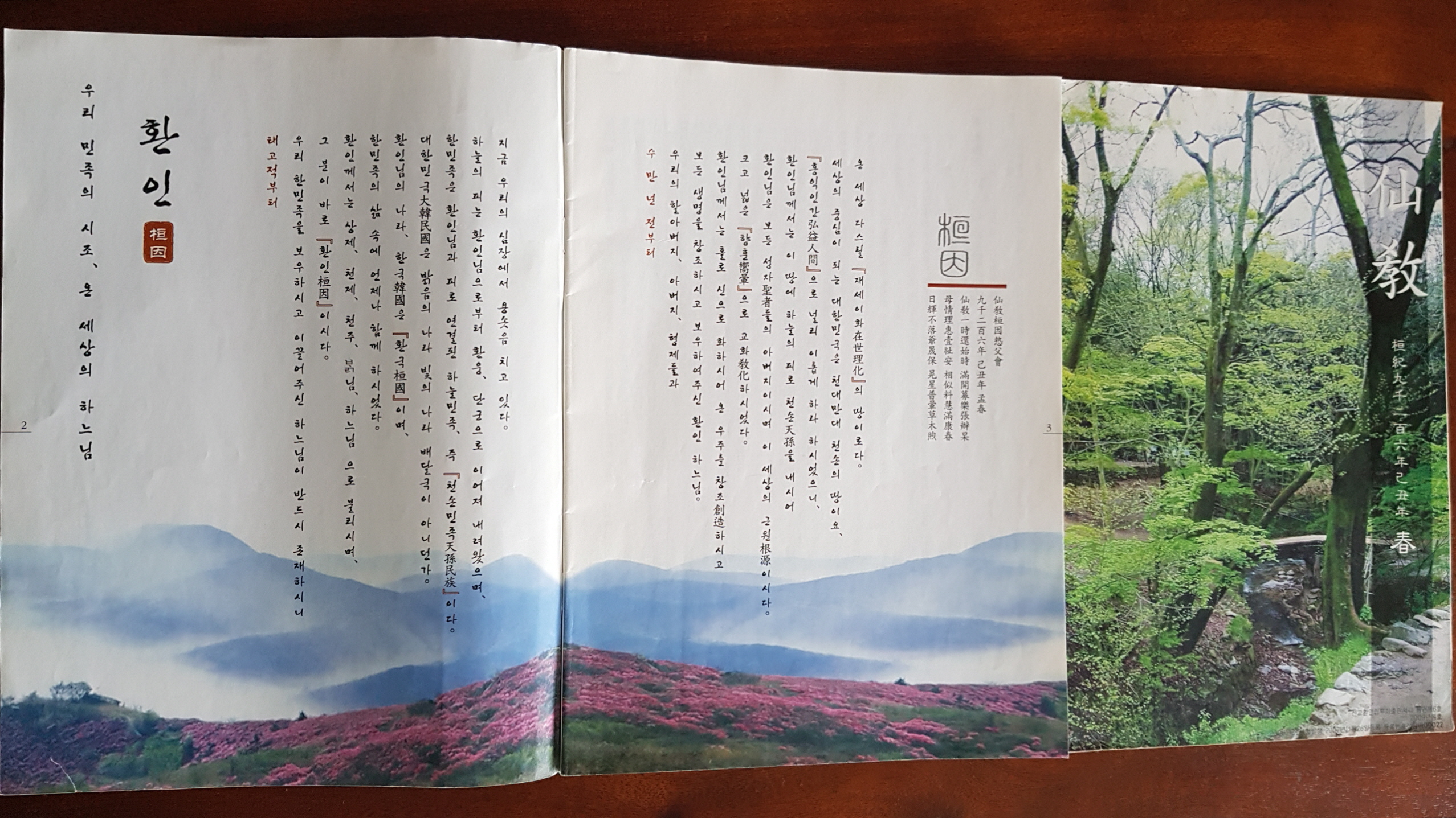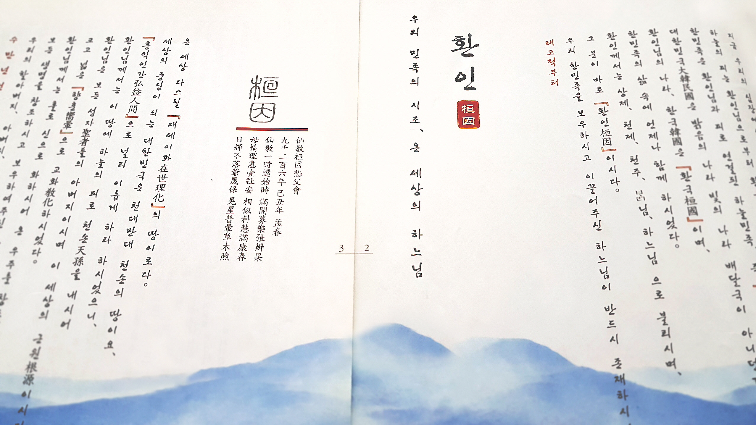하느님 환인(桓因)께서 천지(天地)를 창조하시고 환인(桓仁)께서 환국(桓國)을 세우셨다.