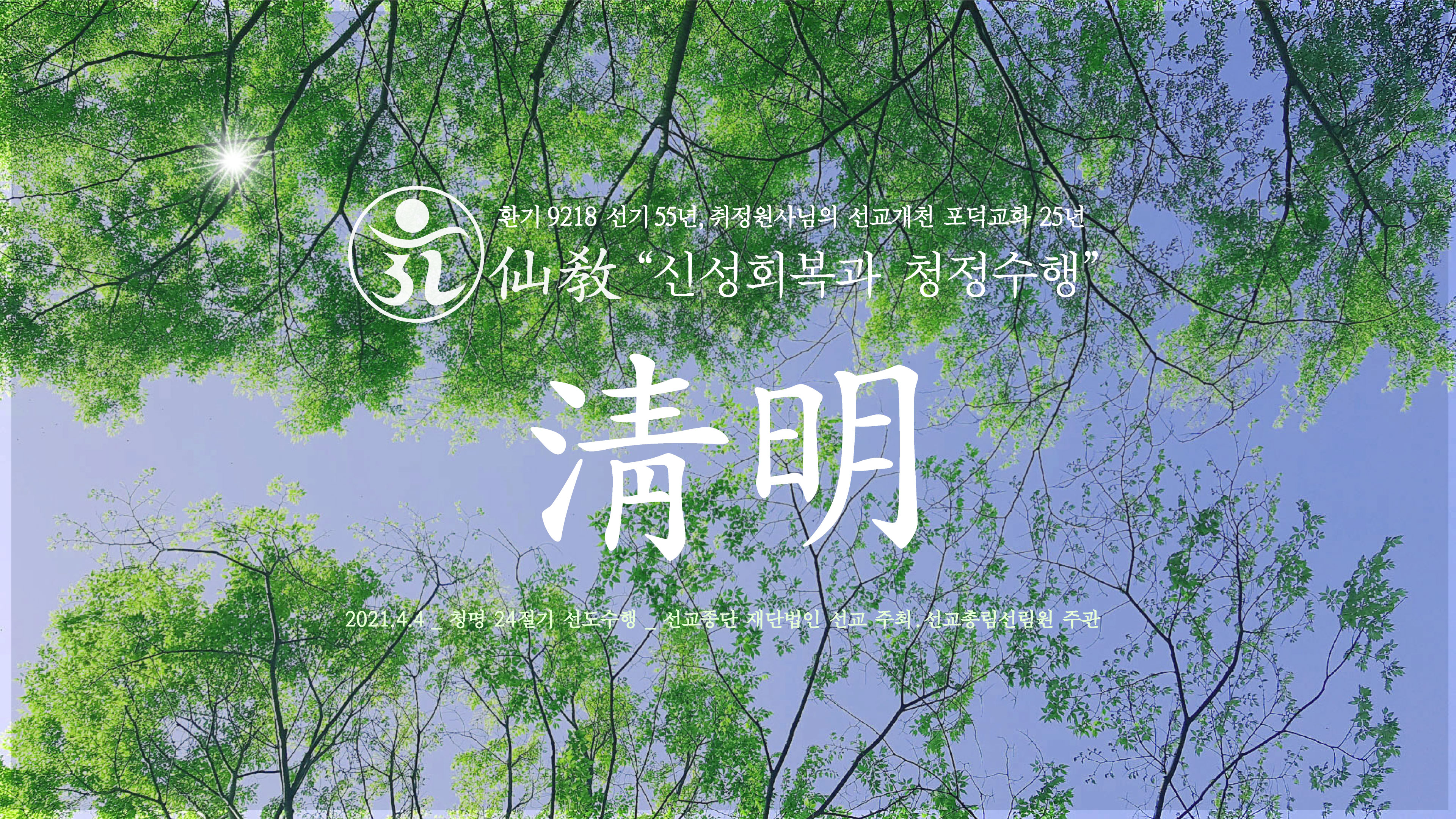 선교 창교절, 24절기 청명(淸明) 절기를 맞아 선교 창교주 취정원사(聚正元師)님의 교유를 전합니다.선교 창교절 신성회복 교유 "청정수행과 신성회복" / 선교수행(仙敎修行) 선도(仙道) 대중포덕 교유 "선교 삼법계(三法戒), 평정운(平正韻) · 정정취(靜精取) · 여가례(麗佳禮) 선교수행으로 인류의 신성회복(神性回復)과 24절기 선교의 절기수행으로 천지인합일(天地人合一) 정회(正回)의 길을 열어간다"