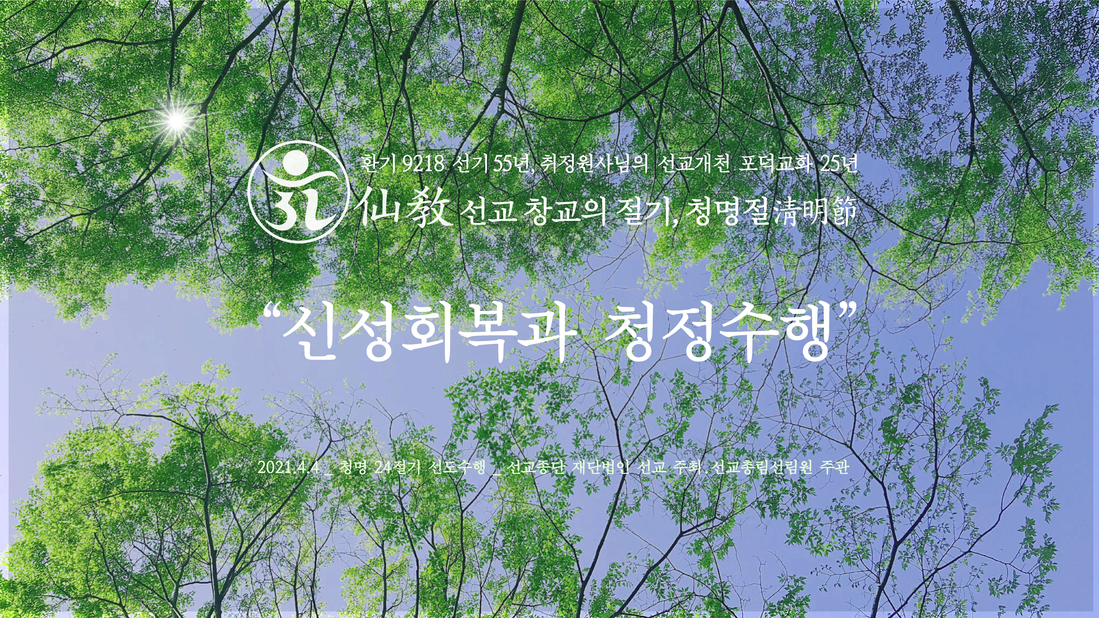 하느님 아버지 환인(桓因)의 향훈이 온 누리에, 청명(淸明)한 이 좋은 시절에, 생무생일체에 신성(神性)의 빛을 밝히고 신성의 꽃을 피우는 “천지인합일 정회세상 환인시대”가 열리기를, 선교 창교의 절기 청명절에 이르러 선교 수행대중과 신성회복을 희구(希求)하는 인류의 소망을 모아 "청정수행 신성회복"을 교유한다.