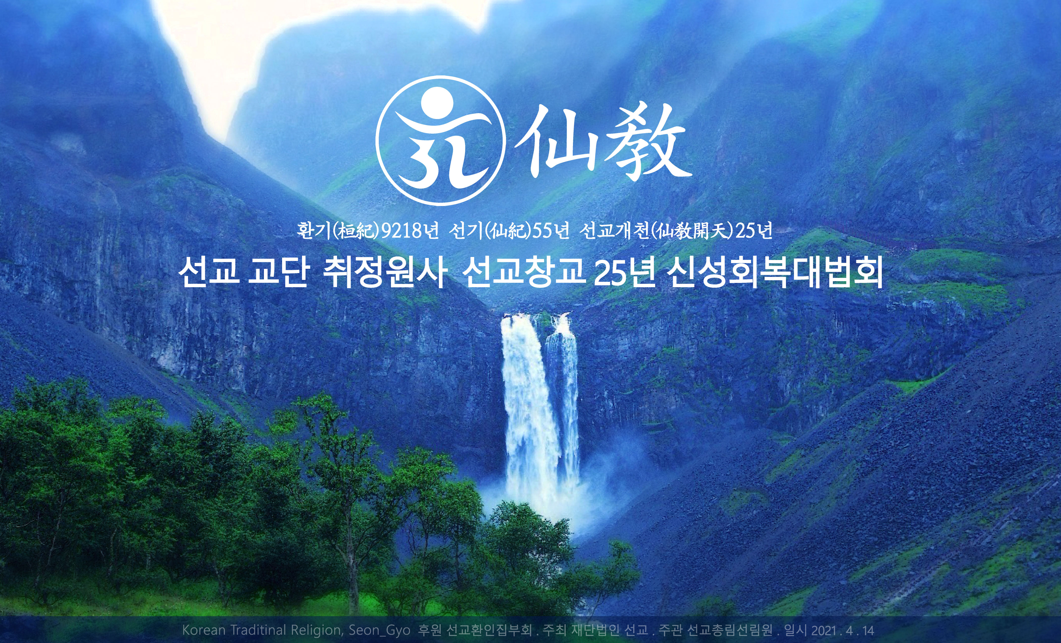인류구원의 종교, 선교(仙敎) 창교절(創敎節)에 신성회복대법회(神性回復大法會)를 봉행하며 대중포덕하는 것은, 온 인류가 다 함께 청정신성(淸淨神性)의 세계인 ‘천지인합일 정회세상(天地人合一正回世上)’을 향해 나아가는 상생(相生)의 의미인 것입니다. 인류의 신성회복을 위해 기도합니다.》