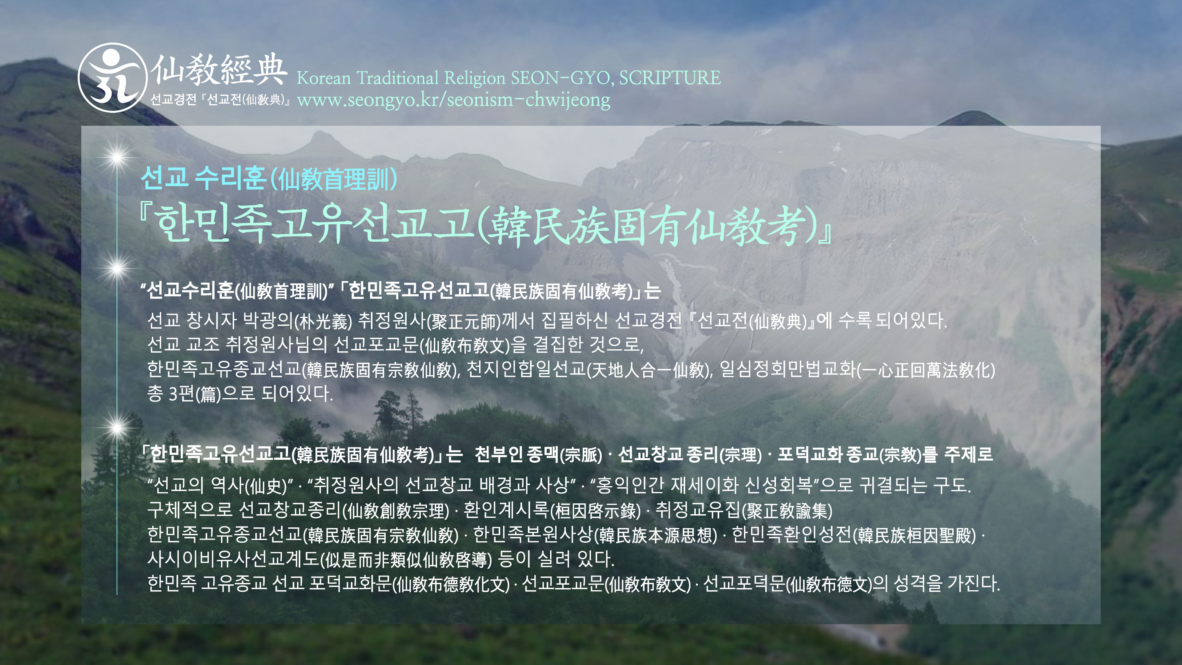 ○ 우리 한민족의 고유한 종교가 있으니 이를 선교(仙敎)라 한다. ○ “환인(桓因)”께서는 무극태역(無極太易)에 홀로 신으로 화하시어(獨化之神), 우주천지(宇宙天地) 생무생일체(生無生一切)를 창조하시고 천부인(天符印)의 진리로 교화(敎化)하시니, 환인(桓仁)의 환국개천(桓國開天), 환웅(桓雄)의 신시개천(神市開天), 단군(檀君)의 소도개천(蘇塗開天)은 모두 하느님 환인(桓因)”의 천부인(天符印)을 계승한 것이다. ○ 귀원일체환시시(歸元一體還始時) 환기9185년 단기4321년 서기1988년 무진년(戊辰年)에 이르러 선교 상왕자 취정원사(仙敎相往者聚正元師)가 환인 상제님으로부터 천부인(天符印)과 개천입교(開天立敎)의 천명(天命)을 받아 천지인합일(天地人合一) 정회사상(正回思想)을 깨달아 선(仙)의 교(敎)를 세우니, 이는 한민족 개천(開天)의 종맥계승(宗脈繼承)이라, ○ 선교(仙敎)는 시대를 구분하여, 창조주 환인상제(桓因上帝)의 생무생일체(生無生一切) 교화(敎化)를 “고대선교(古代仙敎)”라 하며, 취정원사(聚正元師)의 천지인합일정회(天地人合一正回) 교화선(敎化禪)을 “현대선교(現代仙敎)”라 하느니, 이에 취정원사(聚正元師)의 선교창교(仙敎創敎)를 선교개천(仙敎開天)이라 하며, 선교(仙敎)를 한민족 고유종교 선교(韓民族固有宗敎仙敎)라 한다.