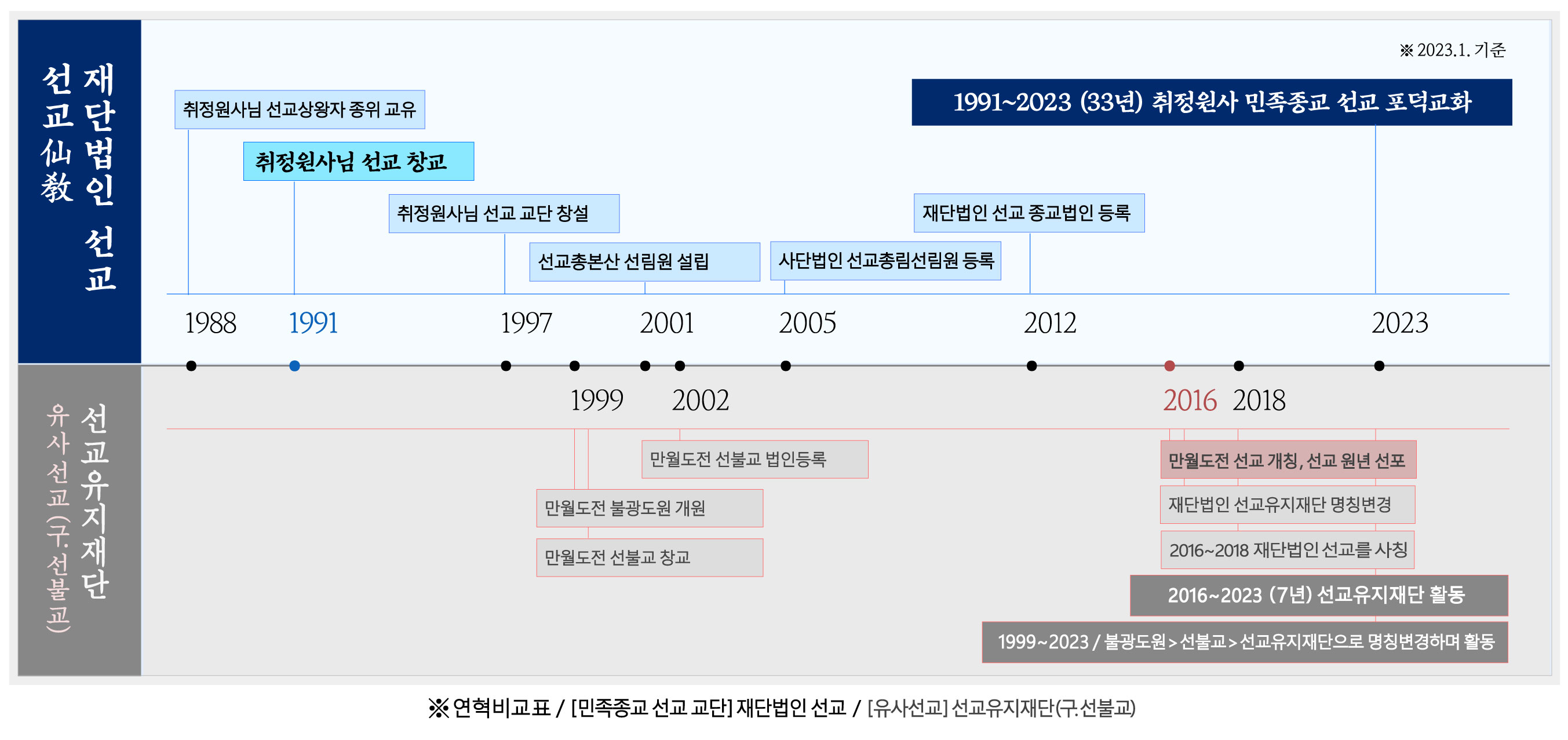 ※ 유사선교단체 충북영동 선교유지재단 만월도전은 2016년 3월에 선교로 임의개칭하고 2016년 5월에 재단법인 선불교를 선교유지재단으로 변경했을 뿐, 1994년 선교를 창교한 사실이 없습니다. 만월 도전은 스스로 2016년이 선교 원년이라고 선포한 바, 2023년은 만월 도전 선교유지재단 활동 7년입니다.