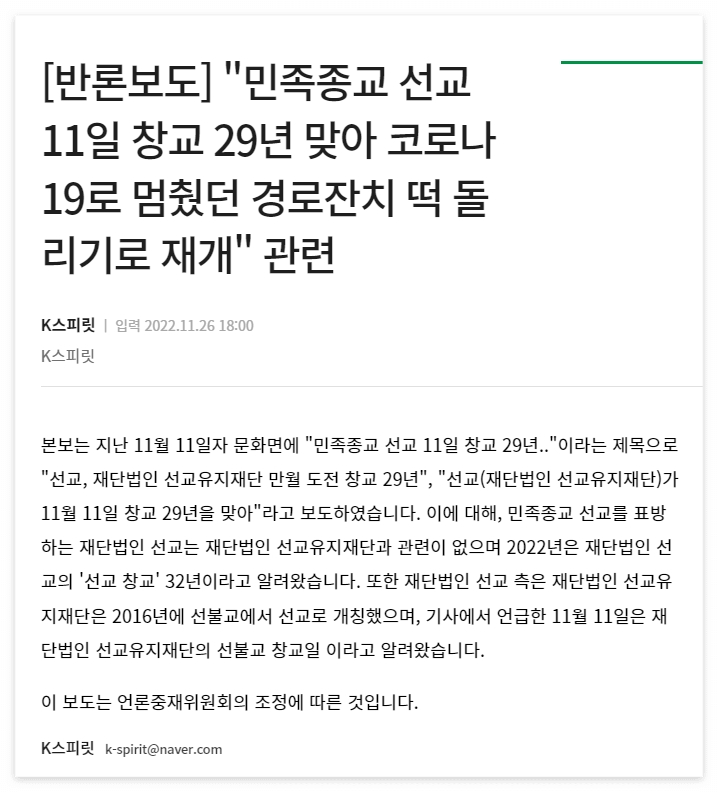 ▲ 4. 만월도전(선교유지재단)의 선교창교왜곡 관련 언론중재위원회의 정정반론 조정 (K스피릿 2022.11.26)